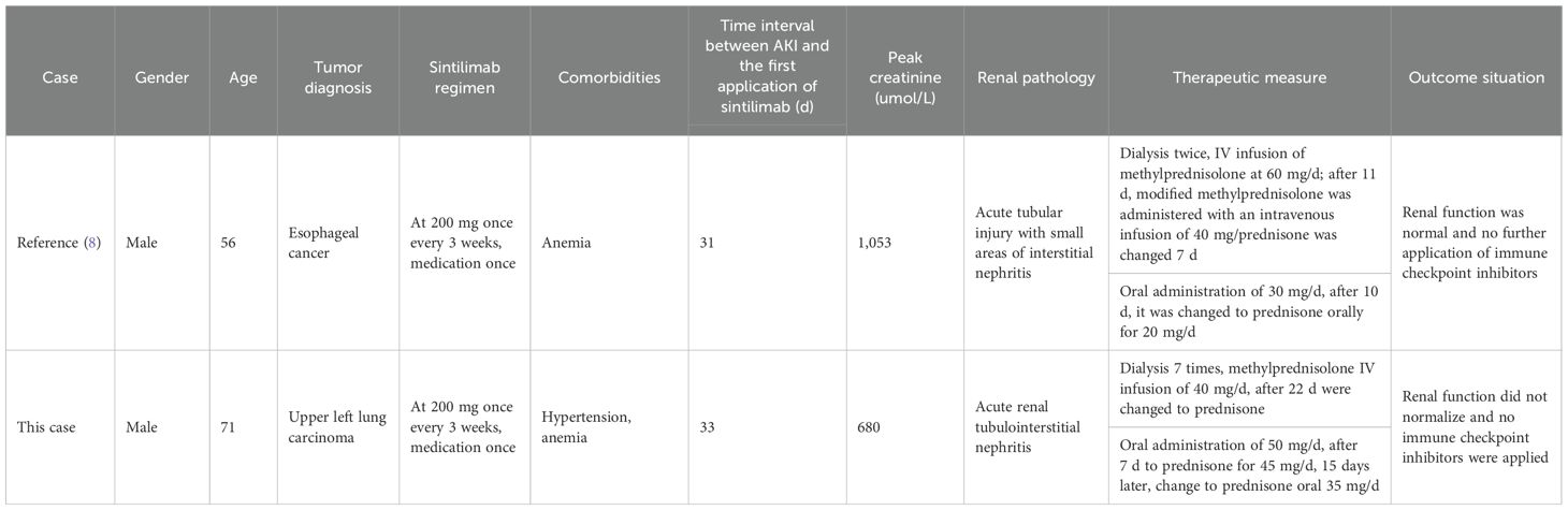 Currently, only one case of dialysis treatment after AKI has been previously reported (8), and this paper reports the second case. The details of the patient reported in (8) and our patient are presented in Table 2. The patient in (8) underwent stage 3 AKI dialysis treatment for XX days and the patient in our case report underwent the same treatment for YY days after receiving sintilimab. The pathological types of the two patients were the same; both were treated with glucocorticoids and ceased ICIs treatment. The kidney function of the first patient (8) returned to normal. The renal function of our patient did not return to normal and developed into chronic kidney disease following the discontinuation of sintilimab. There was no tumor progression during the late follow-up of the two patients.