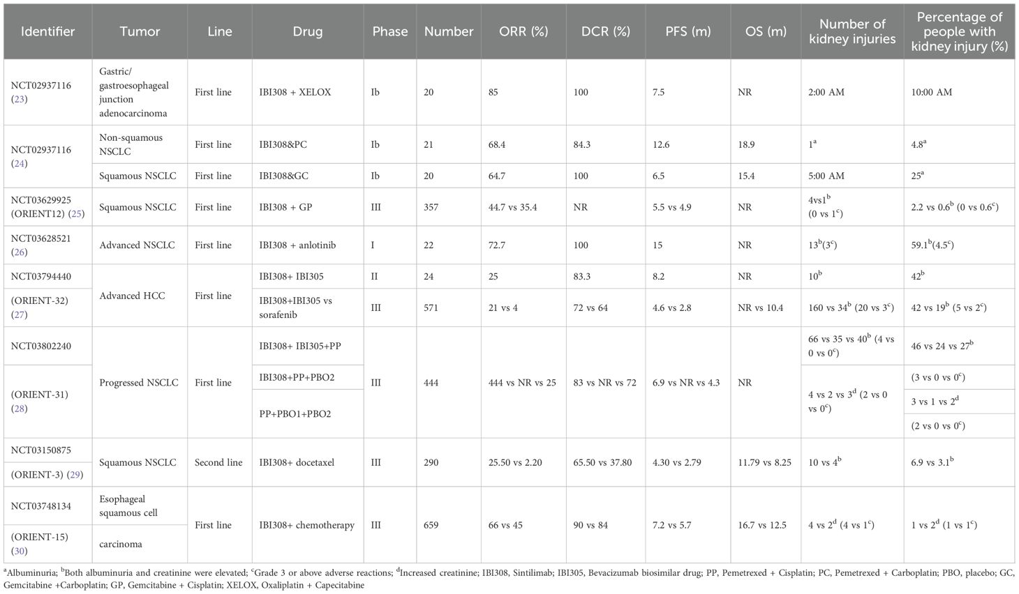 Table 3 summarizes findings from clinical trials of sintilimab, indicating substantial variability in the reported incidence of acute kidney injury (AKI) across studies. In clinical studies on, for example, classical Hodgkin lymphoma, gastric or esophageal junction cancer, lung cancer, recurrent or metastatic cervical cancer, liver cancer, and esophageal cancer (21–28) (see Table 3), the incidence of simple proteinuria is 4.8%–25% (21–23) and the incidence of proteinuria and creatinine is 2.2%–59.1% (24, 25, 27). The incidence of isolated creatinine elevation ranges from 1% to 3%, the majority of which are grade 1 or 2. Only six patients exhibited grade 3 or higher creatinine elevation (26, 28). The instructions indicate that among 2,461 patients who received 200 mg of sintilimab every 3 weeks, 568 were treated with sintilimab monotherapy and 1,893 received another treatment combined with sintilimab. In monotherapy cases, the incidence of proteinuria was 17.4%, and in combination therapy cases, the incidence of proteinuria was 22.2%. The incidence of AKI in 2,461 patients was less than 1%. The incidence of immune-related nephritis was 0.4% (11 cases); there was one case of grade 1 (< 0.1%), three cases of grade 2 (0.1%), seven cases of grade 3 (0.3%), and no cases of grade 4. Obviously, the incidence of adverse reactions of AKI above level ≥ 3 is very low.