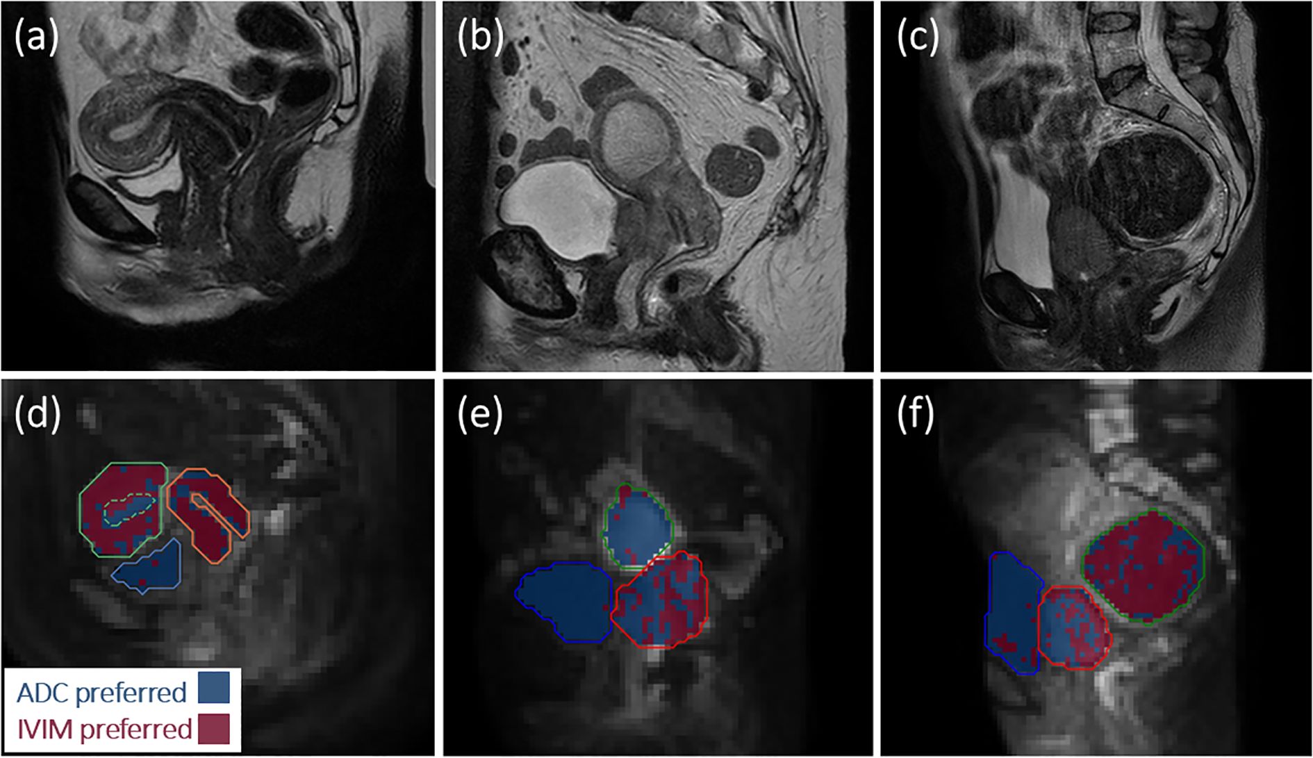 Figure 1. Anatomical images (a-c) and model preference maps overlaid on b = 800 s/mm2 images (d-f) for (a, d) one healthy volunteer, and (b, e), (c, f) two patients. In (d–f), blue represents voxels where the ADC model is preferred and red represents voxels where IVIM is preferred. For the healthy volunteer in (d), ADC is preferred in the bladder (blue contour) and uterine fluid (green dashed contour), while IVIM tends to be preferred throughout the cervix (orange contour) and myometrium/junctional zone (green contour). For the patient in (e), ADC is preferred in the bladder (blue contour) and uterine fluid (green contour), while there is spatial variation in the preferred model throughout the tumour (red contour). For the patient in (f), ADC is preferred in the bladder (blue contour), IVIM tends to be preferred in the fibroid (green contour), and there is spatial variation in the preferred model throughout the tumour (red contour).