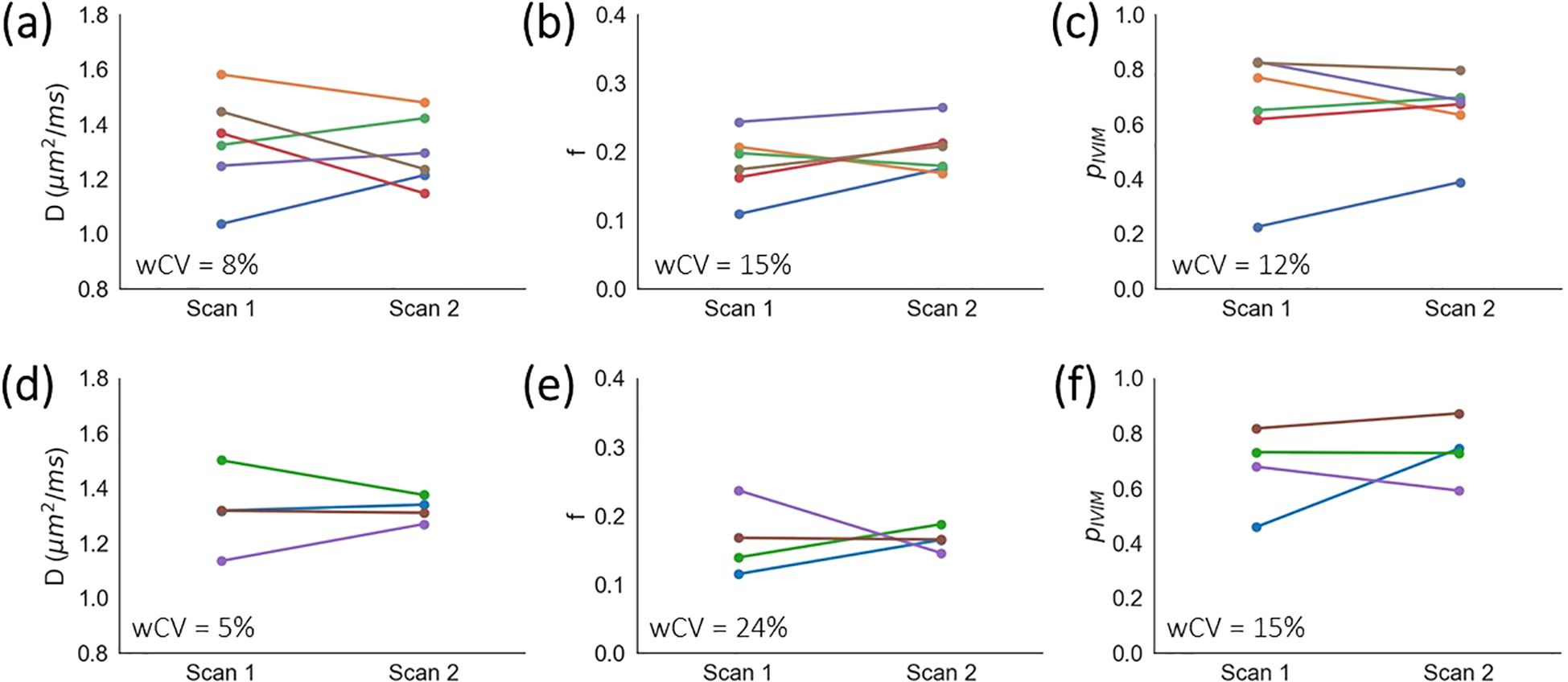 Figure 2. Healthy volunteer repeatability. Median D, median f, and pIVIM values are plotted for repeat scans for (a–c) cervix and (d–f) uterine body ROIs. Each colour represents an individual healthy volunteer.