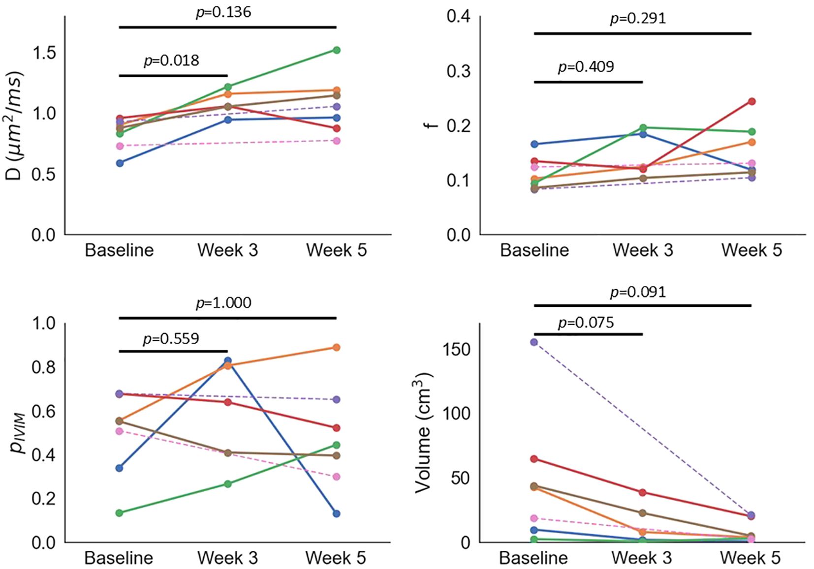 Four line graphs displaying data over Baseline, Week 3, and Week5. Top left graph shows D (micrometers squared per millisecond) with significant changeat p=0.018 at week 3. Top right graph shows f, with no significant change. Bottom left graph shows p_IVIM with no significant change. Bottom right graph shows volume in cubic centimeters, with no significant change. Each graph uses colored lines to distinguish data from each patient.