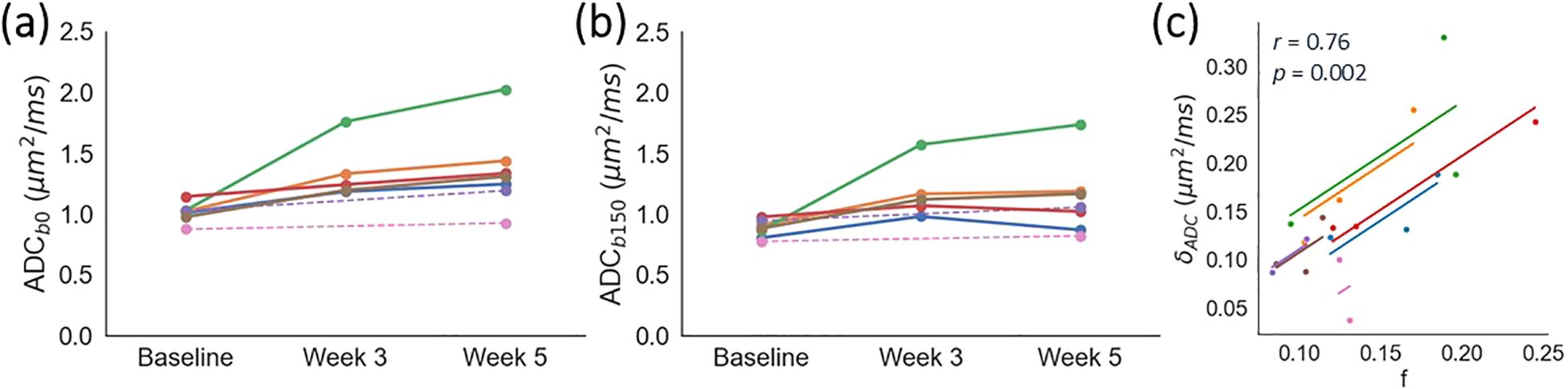3 graphs showing changes in ADC values over time and correlations between ADC differences and f.. Chart (a) illustrates ADC_b0 values at baseline, week three, and week five.Chart (b) displays ADC_b150 values at baseline, week three, and week five. Chart (c) is a scatter plot showing that the difference between ADC_b150 and ADC_b0 hasa positive correlation with f (r = 0.76, p = 0.002).