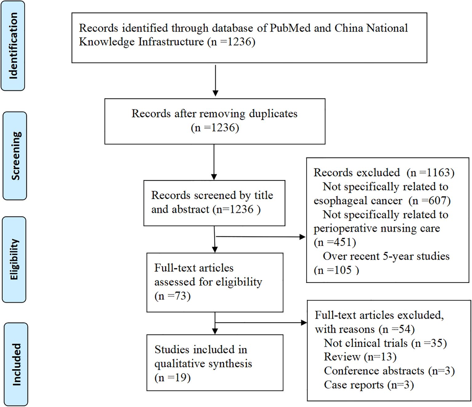 The study selection process is summarized in Figure 1. A total of 1,236 articles were initially identified. After screening titles and abstracts, 1,163 records were excluded due to lack of relevance to EC (n = 607), perioperative nursing care (n = 451), or over recent 5-year publications (n = 105). The full texts of the remaining 73 studies were reviewed in detail. Of these, 54 studies were excluded for not involving clinical trials. Ultimately, 19 clinical trials met the inclusion criteria and were included in this study.