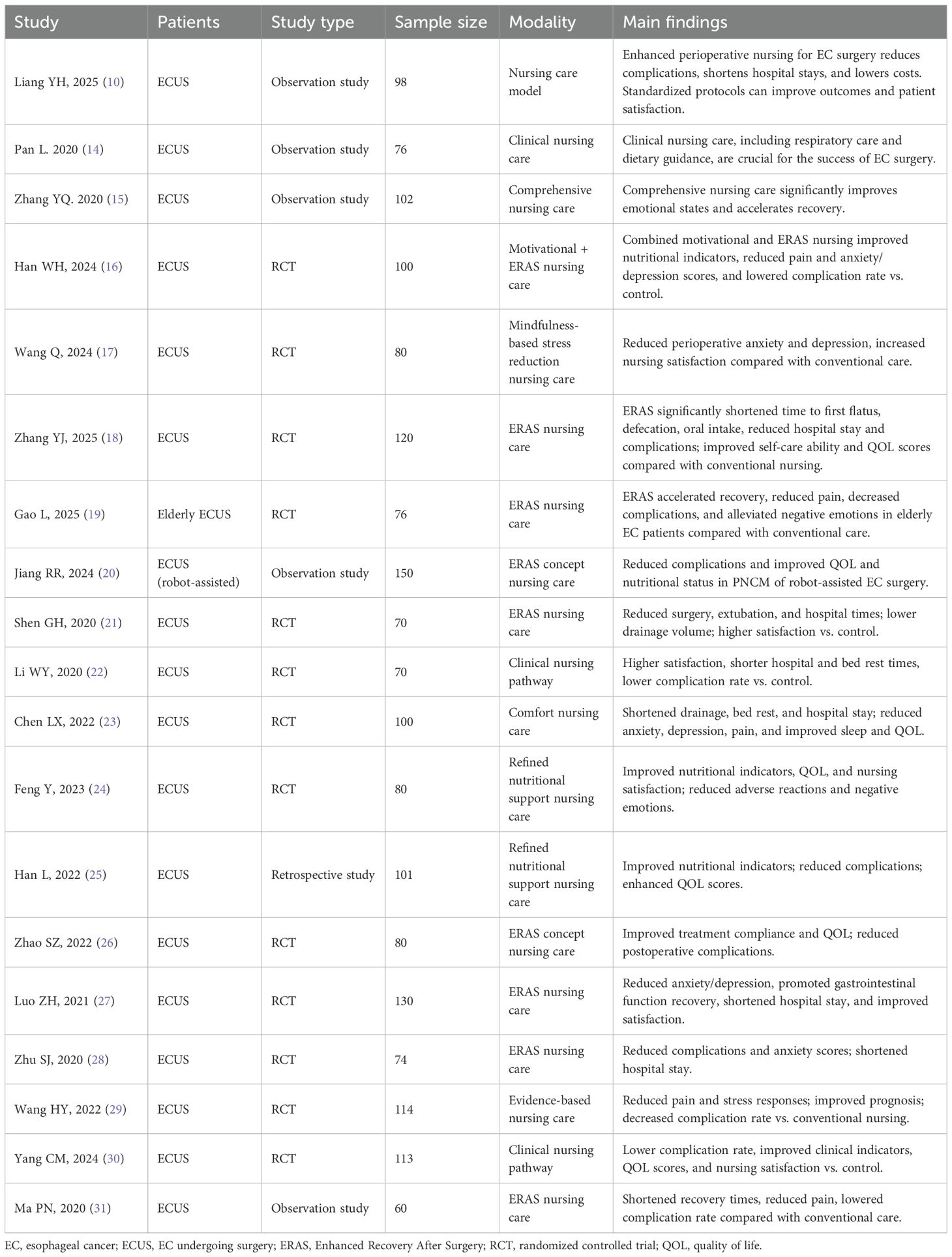 Table 1. Summary of clinical studies on perioperative nursing care managements for patients with EC surgery.