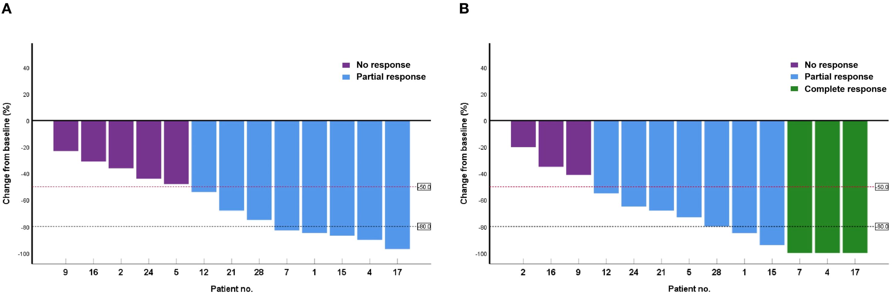 Figure 1. Waterfall plot of changes in malignant pleural effusion from baseline at weeks 6 (A) and 12 (B) in 13 patients.