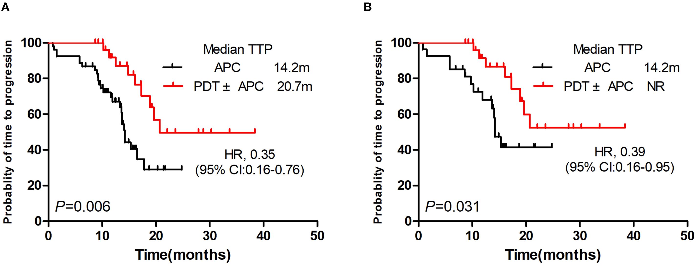 TTPs were significantly longer in the PDT ± APC group than in the APC group (median, 20.7 vs. 14.2 months; P = 0.006; HR = 0.35; Figure 2A). This difference persisted after PSM (P = 0.031, HR = 0.39). The median TTP had not yet been reached in the PDT ± APC group (Figure 2B).