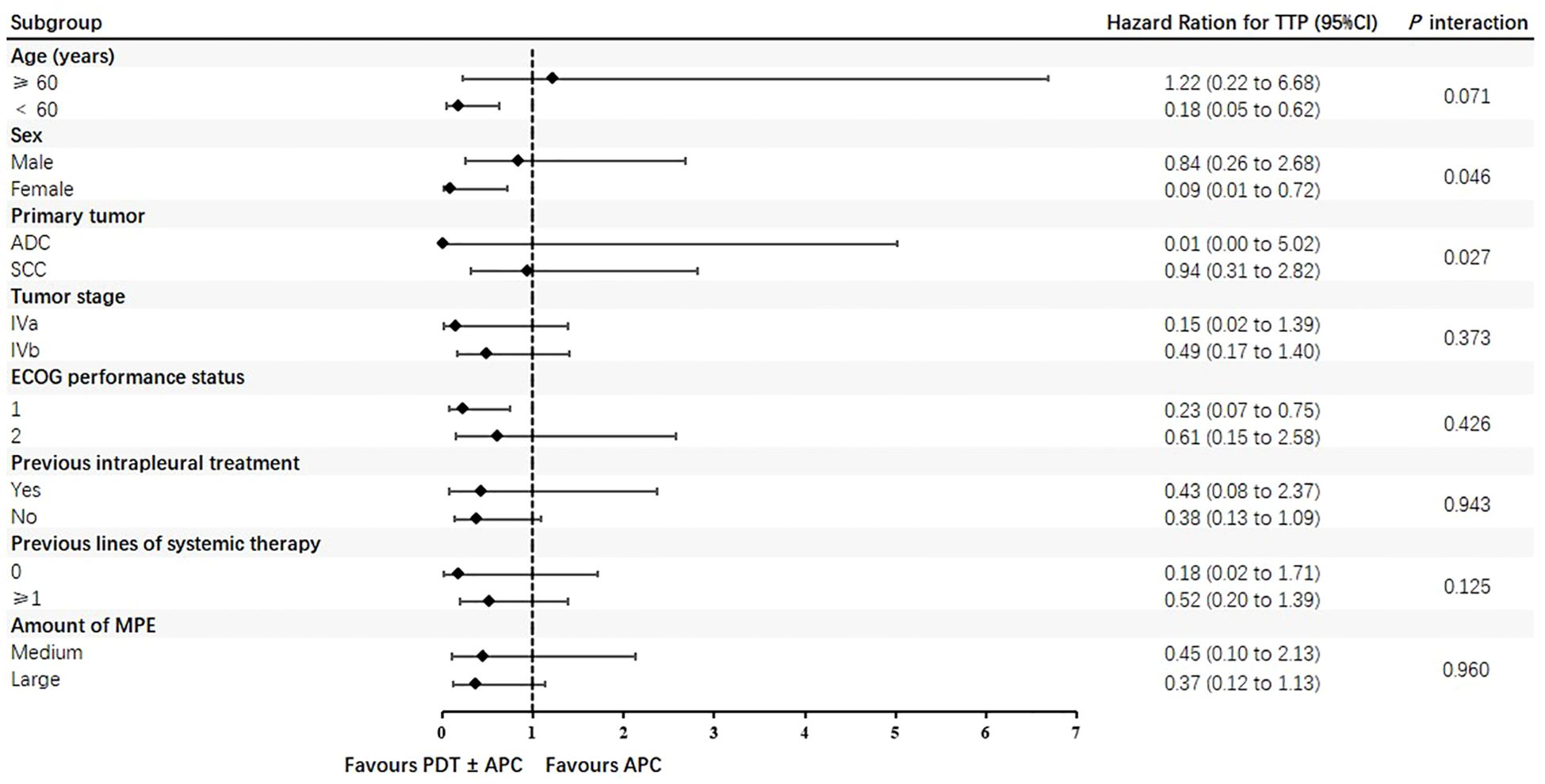 Subgroup analyses by major lesion type, intrapleural treatment, and energy density were performed for the TTP and ORR. The TTP was extended in patients with nodular pleural lesions, those who received PDT + APC therapy, and those treated with a 576-J/cm2 energy density, but not significantly so. Subgroup findings for the TTP in the PDT ± APC and APC groups are presented as forest plots in Figure 3. HRs for the TTP were <1.0 for almost all subgroups. In addition, the upper limits of 95% CIs were <1.0 for the age < 60 years, female sex, and ECOG score < 1 subgroups. Subgroup ORRs at weeks 6 and 12 are provided in Table 4.
