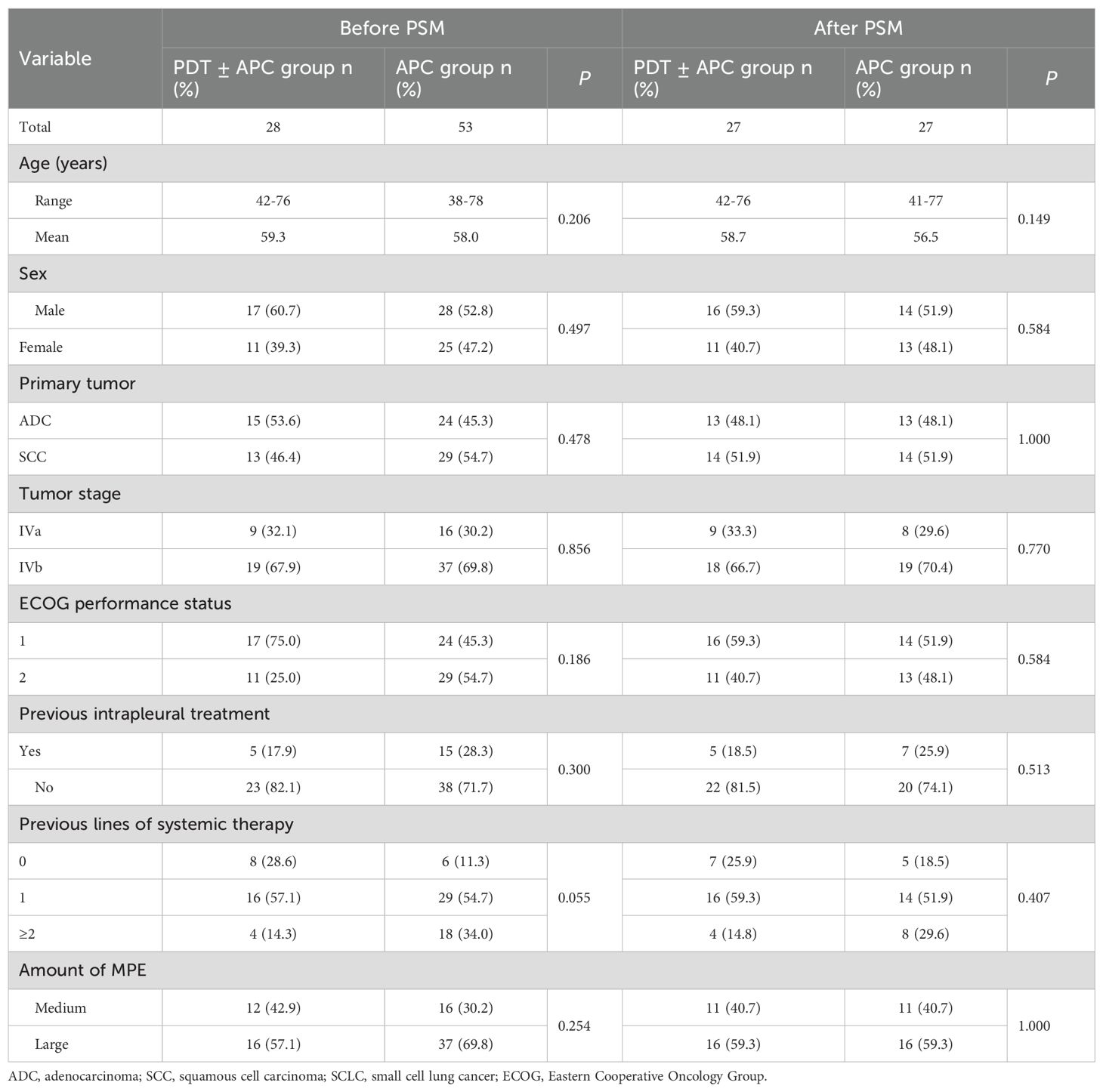 Twenty-eight patients were enrolled as the observational group and received PDT ± APC therapy. Eight of these patients had plaque-like pleural lesions and PDT alone, and 20 patients had nodular or mass-like pleural lesions and received PDT + APC therapy. Fifty-three patients who received APC therapy in our previous study were included as the control group. Following propensity score matching (PSM), we selected 54 patients (27 pairs). Baseline characteristics did not differ between these two groups before or after PSM (Table 1). The irradiation time and energy density used for each patient are shown in Table 2.
