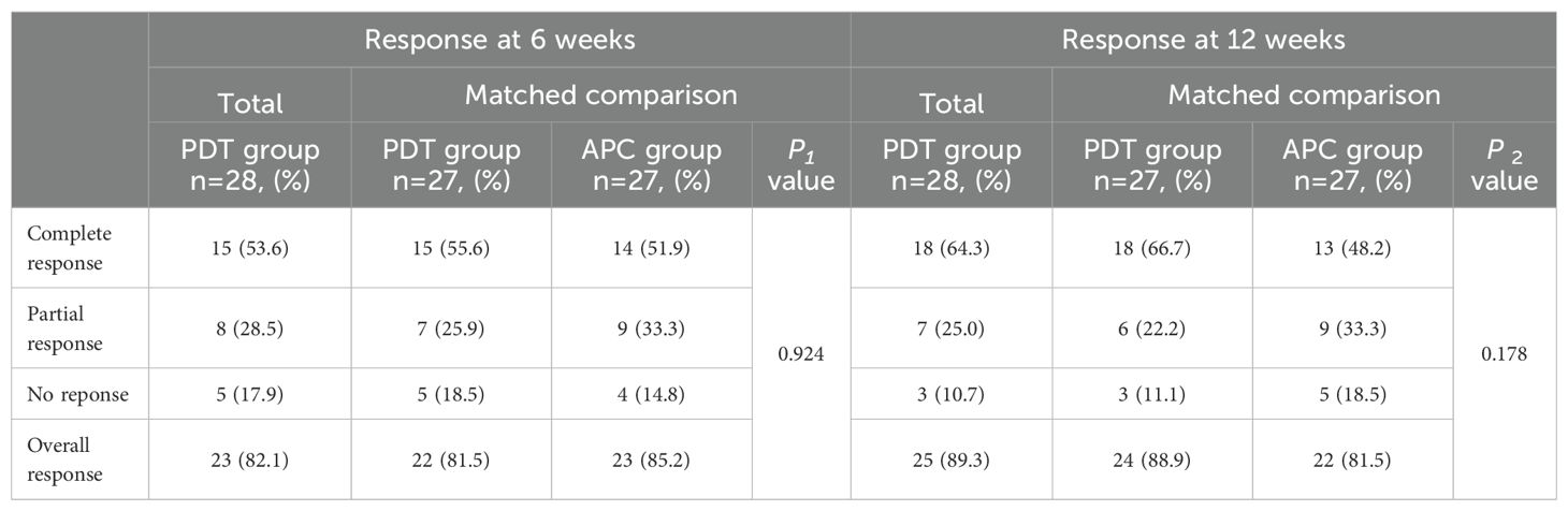 Results: In total, 28 patients with non-small lung cancer (NSCLC) were enrolled. Eight patients underwent PDT alone and 20 patients underwent PDT and APC. At week 6, the overall response rate in the observation group was 82.1% (complete response in 15 cases and partial response in eight cases). At week 12, this rate had increased to 89.3%. The TTP was significantly longer in the PDT ± APC group than in the APC group (median, 20.7 vs. 14.2 months; P = 0.006; HR = 0.35). The 1-year survival rate was 75% (21/28).
