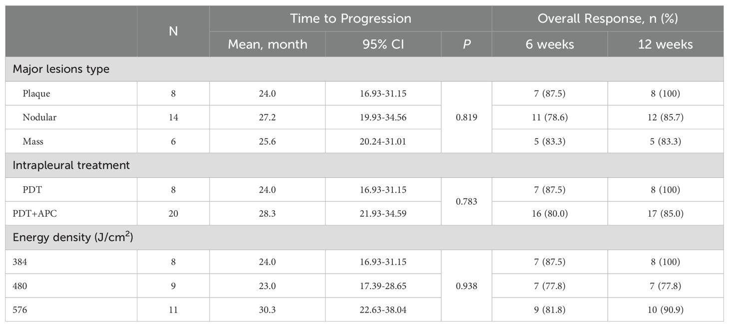 In this exploratory pilot study performed to evaluate the clinical efficacy of PDT with and without APC for MPE with pleural disease, the ORR at 6 weeks after treatment was satisfactory, in line with our previous findings for APC therapy (8). This response was found to be durable, with a trend toward a higher ORR at week 12 that was not observed in the APC group. Moreover, the 1-year survival rate was up to 75%, even though these patients had not received targeted therapy or immunotherapy and had received second or more systemic treatment lines, which tend to be associated with worse prognoses (12, 13). The median TTP for the observational group in this study far exceeds that representing our institutional experience with APC therapy without PDT for MPE. Subgroup analyses suggested that PDT + APC and the use of 576 J/cm2 energy density tend to prolong the TTP, although the results were not significant. These findings suggest that PDT with or without APC is more effective and offers more potential advantages than does APC therapy alone.