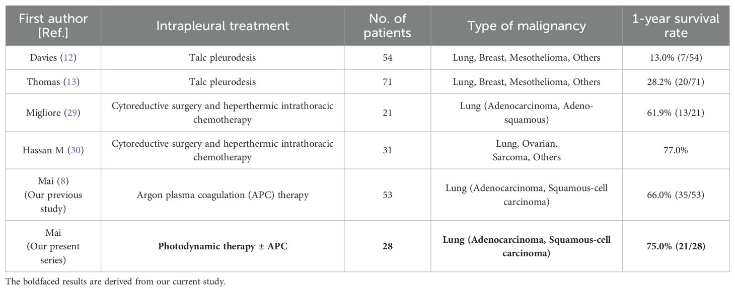 One-year survival rates were 75% (21/28) in the PDT ± APC group and 66% (35/53) in the control APC group. For comparison, reported 1-year survival rates for other intrapleural treatments (talc pleurodesis, cytoreductive surgery, and hyperthermic intrathoracic chemotherapy) are provided in Table 5.