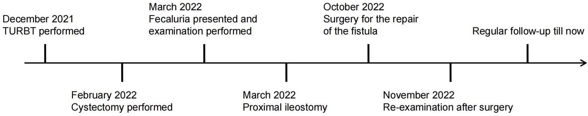 Postoperative recovery was good, and the patient was discharged seven days after the surgery. Twenty days later, cystography revealed that the contrast agent was not present outside the neobladder (Figure 1C). The patient has been regularly followed-up. The patient did not experience fecaluria or digestive discomfort. The daytime and nighttime urinary continence rates were 100% and 75%, respectively. A timeline illustrating the information in this case is presented in Figure 3.