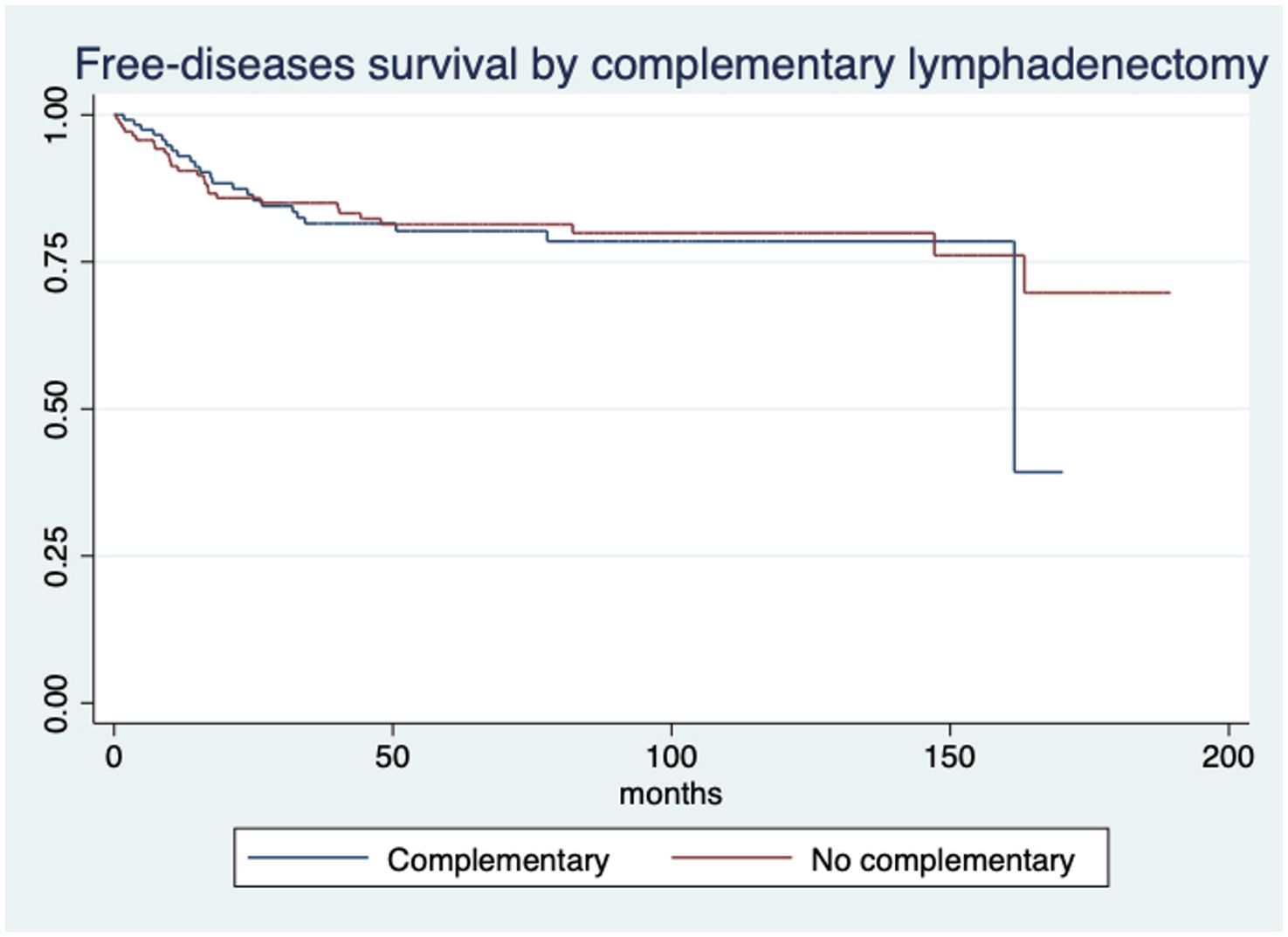 Survival graph showing free-disease survival by complementary lymphadenectomy over 200 months. Two lines are depicted: blue for complementary and red for no complementary lymphadenectomy, with similar survival rates until late into the timeline where the complementary line dips.