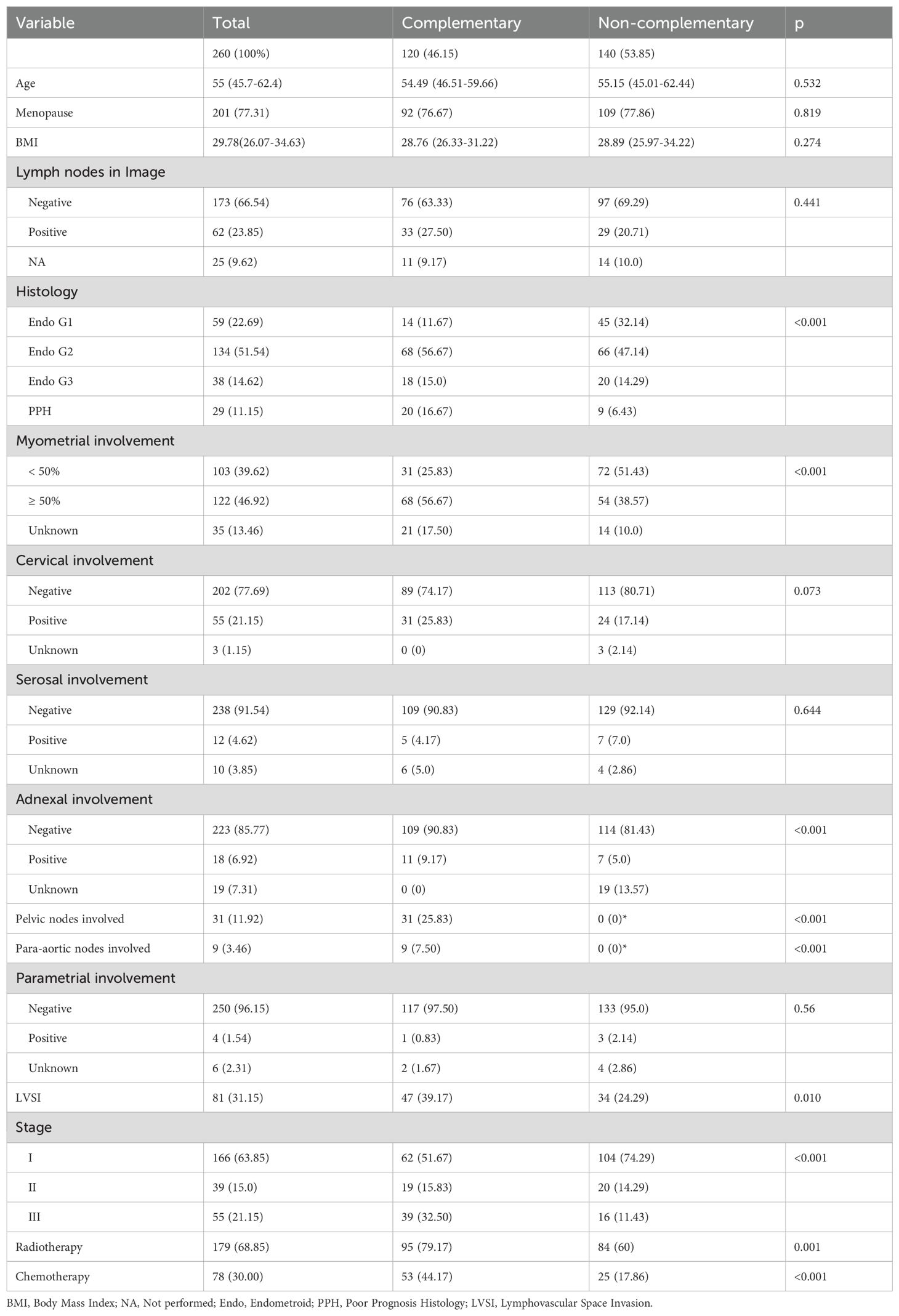 The median age was 55 years (IQR 45.7-62.4). In total, 62 patients (23.85%) with suspicious nodes were identified by imaging, and among them. In the pathological evaluation of patients who underwent complementary lymphadenectomy, 31 (25.83%) had nodal involvement; among these patients, 22 had pelvic involvement, and 9 had both pelvic and para-aortic involvement. No patients had only para-aortic disease. There were 166 (63.85%) patients with stage I disease, 39 (15.0%) with stage II disease and 55 (21.15%) with stage III disease. In the comparison between the complementary lymphadenectomy group and the group without lymphadenectomy, there were significant differences in histological type (p<0.001), myometrial involvement (p<0.001), adnexal involvement (p<0.001), extensive lymphovascular space invasion (p=0.010), clinical stage (p<0.001), radiotherapy (p=0.001) and chemotherapy (p<0.001) (Table 1).