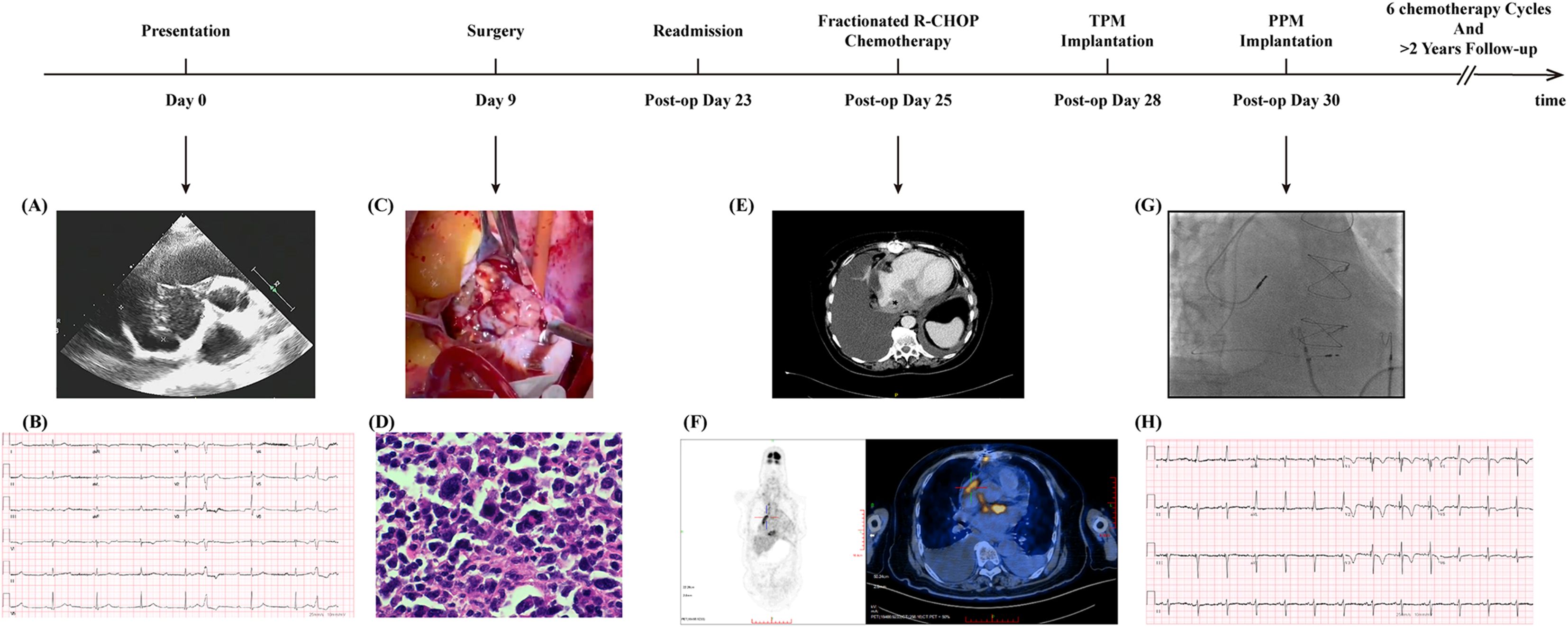 Figure 1. Timeline and representative clinical findings of the patient. A timeline illustrating the key clinical events, interventions, and findings during the patient’s diagnosis, treatment, and follow-up period. “Post−op” (post operation) refers to the period after surgical resection of the tumor. TPM, temporary pacemaker; PPM, Permanent Pacemaker. (A) Transthoracic echocardiography at initial presentation. A well-defined intracardiac mass involving the right atrium with dimensions of 62×39 mm. (B) Twelve-lead ECG showing complete atrioventricular block (third-degree AV block) with a junctional escape rhythm at approximately 50bpm. (C) Intraoperative photograph during tumor resection. A right atrial lobulated mass measuring approximately 70×45 mm, attached to the fossa ovalis of the interatrial septum, well circumscribed with a broad base, and nearly occupying the entire right atrium. (D) Histopathological examination confirmed lymphoma infiltration. Immunohistochemistry supported a diagnosis of diffuse large B−cell lymphoma, intermediate variant, classified as non−GCB subtype by the Hans algorithm. (E) Contrast-enhanced chest CT scan on the second admission revealed a residual mass. A soft tissue focus inferior to the atrium and a nodular lesion at the right cardiophrenic angle suggest possible lymphoma infiltration. Soft tissue is indicated by an asterisk. (F) PET-CT demonstrates significant metabolic activity of the cardiac tumor. Left: Whole-body maximum-intensity-projection (MIP) image showing focal intense uptake in the region of the interatrial septum. Right: Axial fused PET/CT image depicting interatrial septal thickening with adjacent dilation of the inferior vena cava, demonstrating intense radiotracer uptake on PET/CT (SUVmax 18.4); delayed imaging shows further increased uptake (SUVmax 21.8). (G) Pacemaker implantation displayed by fluoroscopy. The placement of the dual−chamber system and final lead position. Pacing parameters: Atrial lead 4574 (single/dual) positioned in the right atrial appendage; threshold 1.0/1.0 V; sensing 3.0/1.6 mV; impedance 840/740 Ω; Ventricular lead 3830 (single/dual) positioned at the right ventricular septum; threshold 0.9/0.7 V; sensing: temporary pacer capture; impedance 840/840 Ω. (H) ECG after pacemaker implantation. Heart rate 75 bpm with atrial sensing and ventricular pacing; pacing spikes precede the QRS complexes. Lead V1 shows a Qrs morphology, QRS duration 110 ms, and R-wave peak time in V5/V6 of 60 ms.