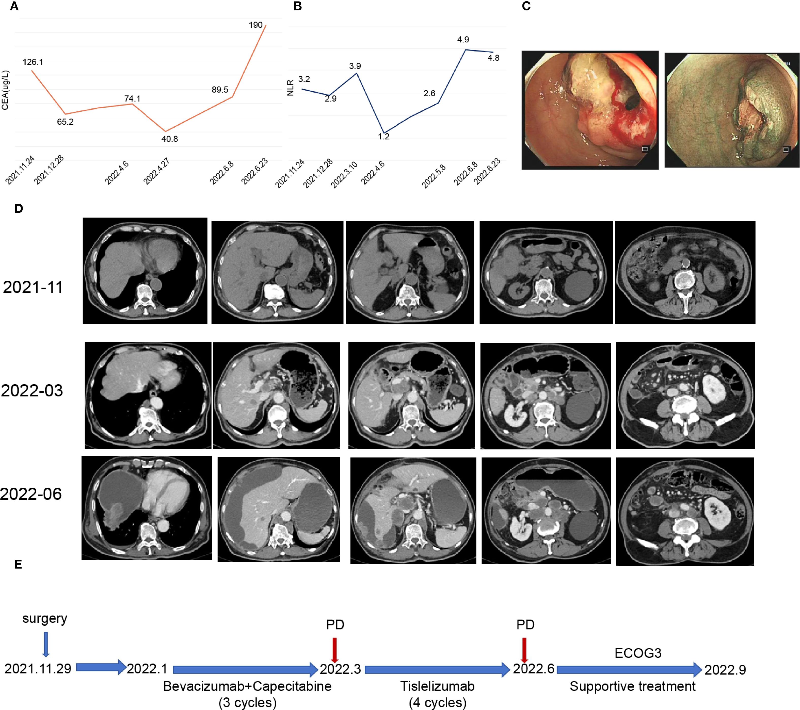 Figure 2. Patient clinical data and medical treatment history. (A) Plot showing changes in carcinoembryonic antigen (CEA) levels during treatment. (B) Graph illustrating changes in the neutrophil–to-lymphocyte ratio (NLR) during treatment. (C) Enteroscopy revealed cauliflower-like growth located 60 cm from the anal opening, which encircled the lumen and resulted in luminal stenosis. (D) Representative imaging images depicting the treatment process. (E) Timeline of the patient treatment process.