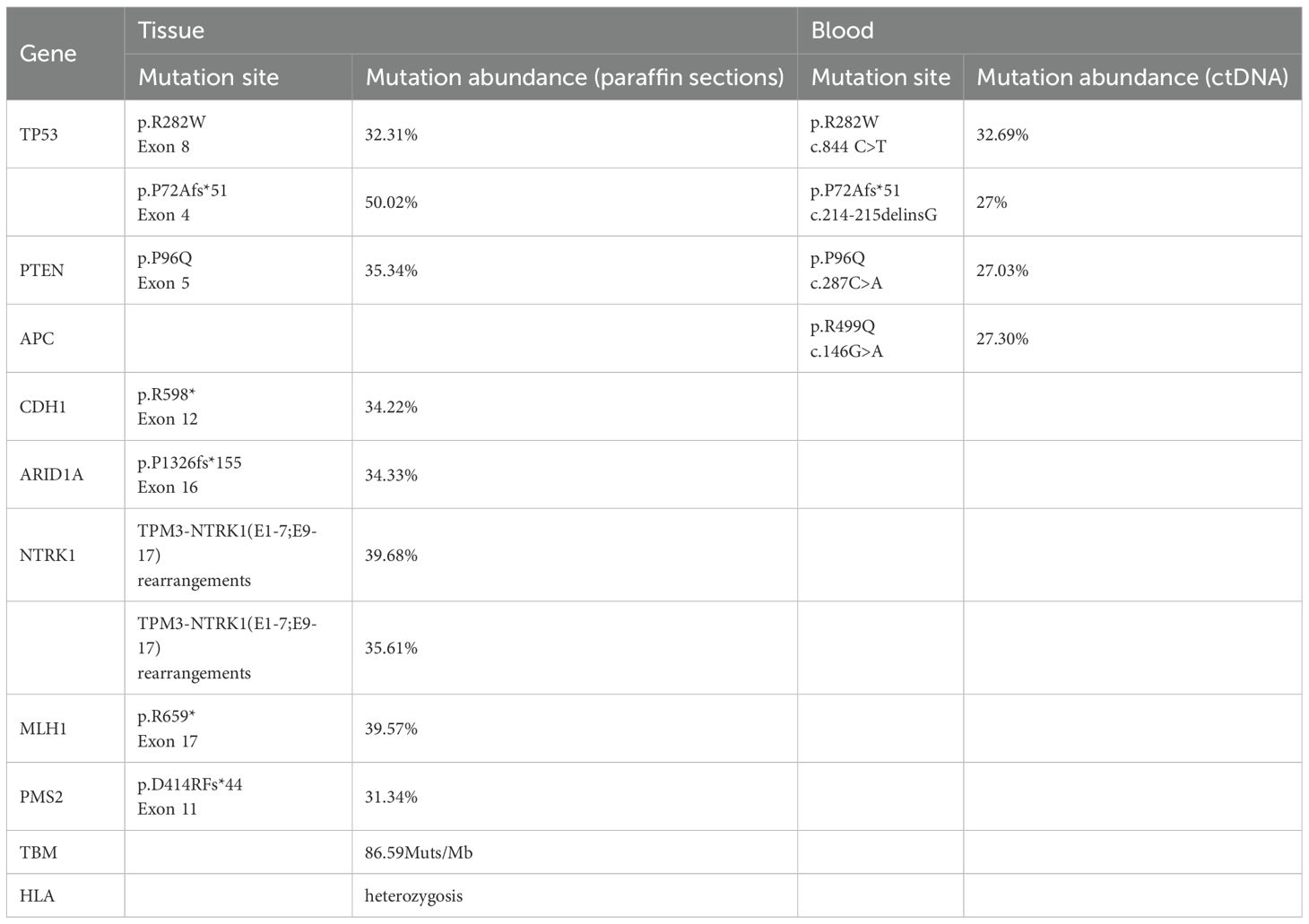 Next-generation sequencing (NGS) analysis of the patient’s postoperative tissue paraffin sections and peripheral blood ctDNA revealed MSI-H, TMB-H (86.59 Muts/Mb), HLA heterozygosity, wild-type KRAS/NRAS/BRAF, NTRK1 rearrangements, and mutations in PTEN, TP53, and CDH1, among others (Table 1).