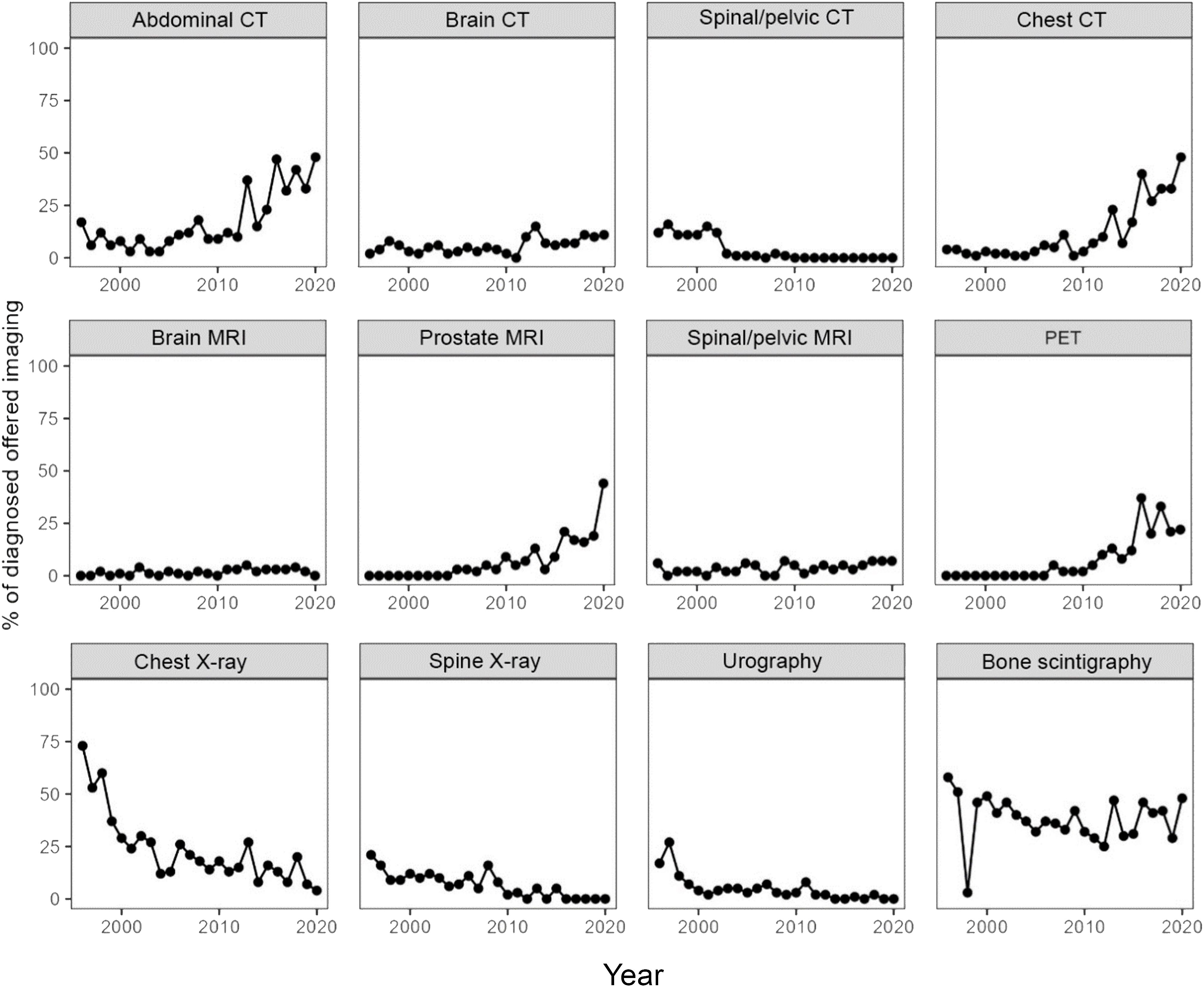 Figure 2. The proportion of diagnosed patients per year who received each type of imaging in conjunction with their diagnosis.