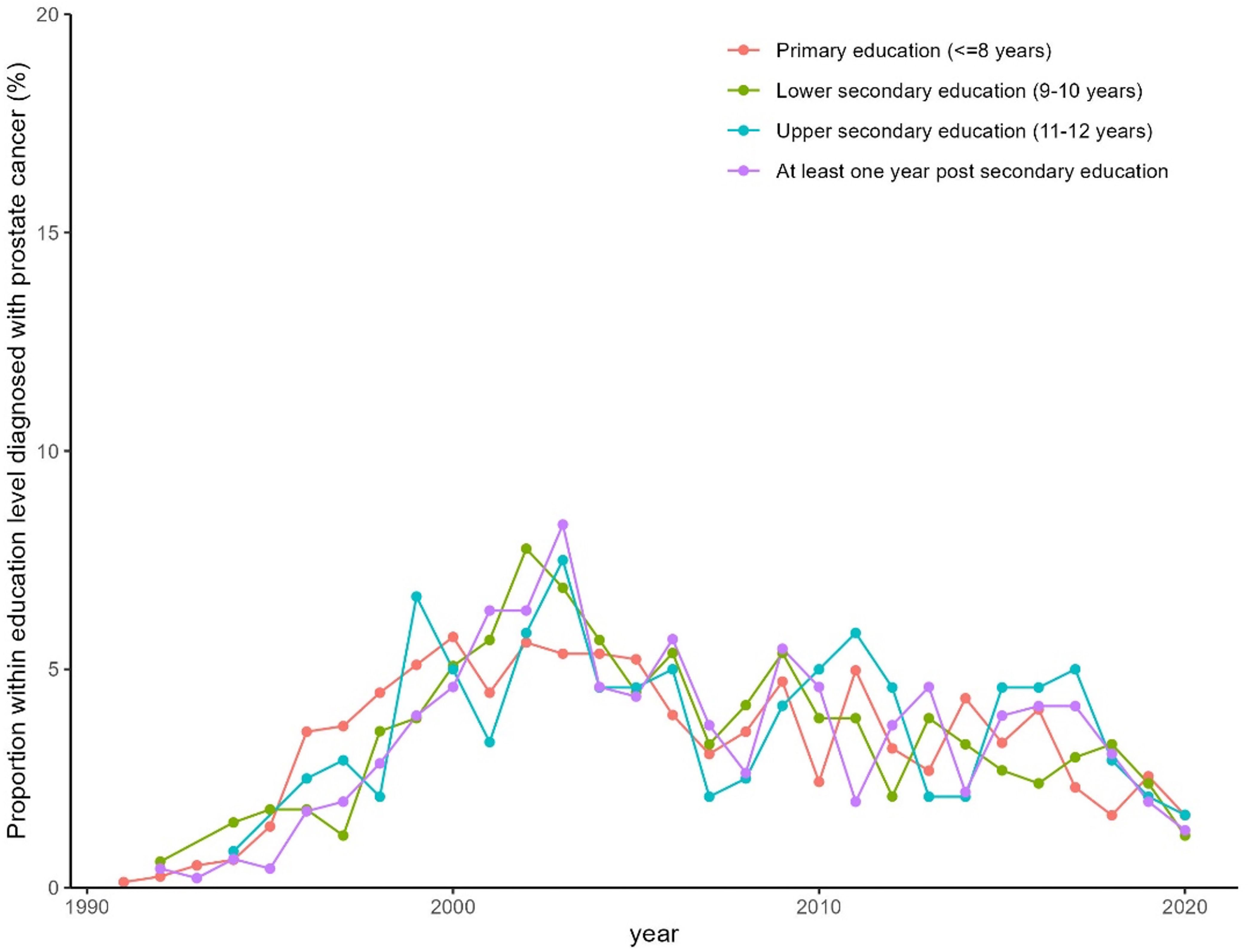 Currently, there are no countries with ongoing population-based screening programs for PCa. Instead, a large proportion of PSA testing has historically been opportunistic, i.e. done on the initiative of the individual patient or physician (9). Socioeconomic factors are known to have an impact on participation in PSA testing, which could impact the outcome of the disease (10). High socioeconomic status correlates with better cancer outcomes, and for patients with PCa, this affects the chance of cancer detection and the time until curative treatment is received (11). Education level is also an important factor that is associated with socioeconomic status as it is determined early in life and deeply influences future employment, income, and usage of the healthcare system (12). Furthermore, education level is relatively easy to measure and tends to be stable over time.