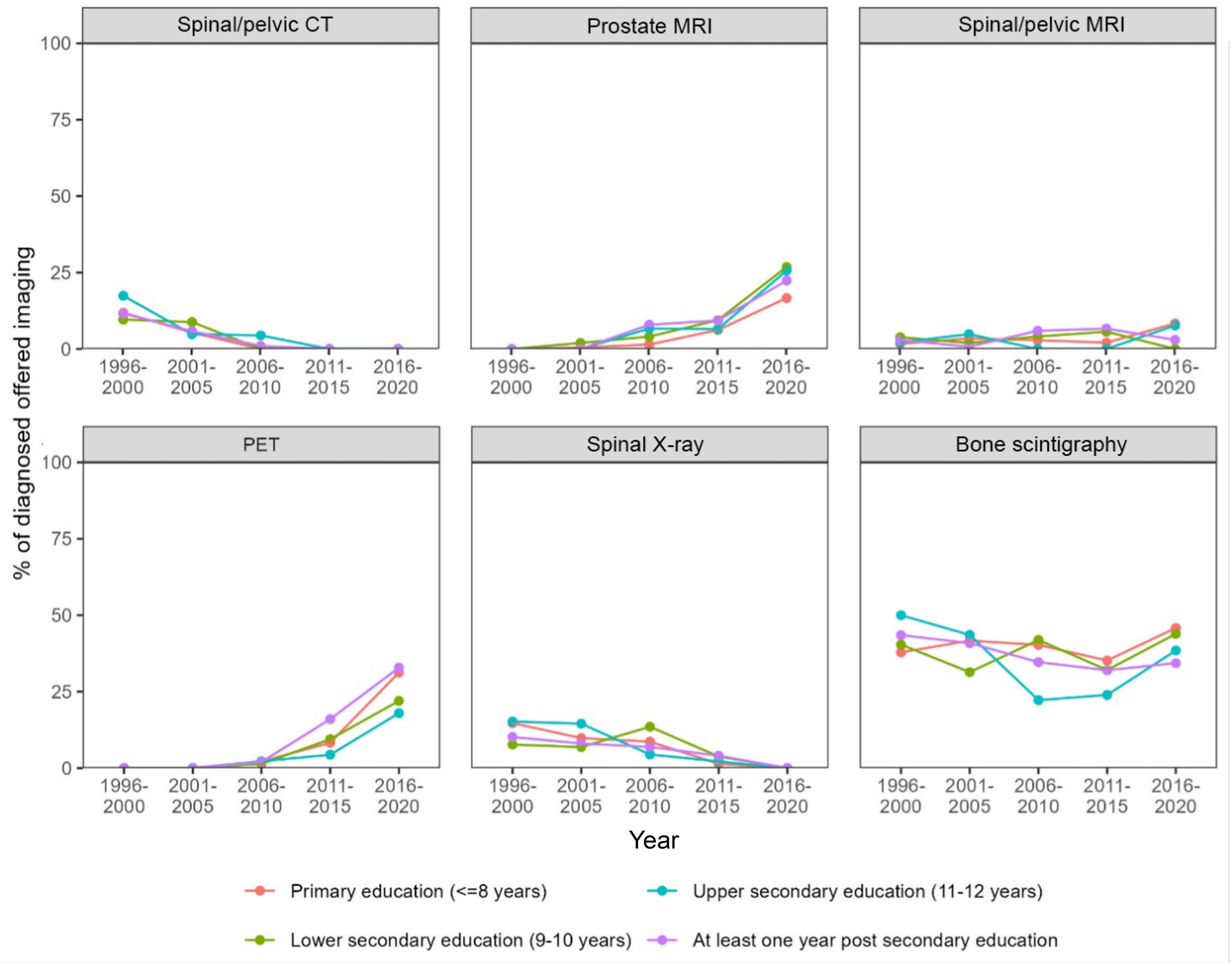 Results: 1,816 men with diagnosed were PCa during the study period were included. No differences were seen between education levels in regard to access to diagnostic methods or tumour aggressiveness at diagnosis. Furthermore, no differences were seen in PCa-specific mortality, but there was higher overall mortality among individuals with a lower education level. During the study period, the use of plain radiographic examinations decreased, while the use of computed tomography (CT), prostate magnetic resonance imaging (MRI), and positron emission tomography/computed tomography (PET/CT) increased.