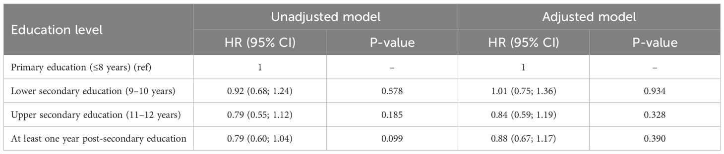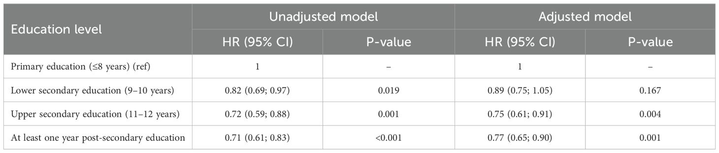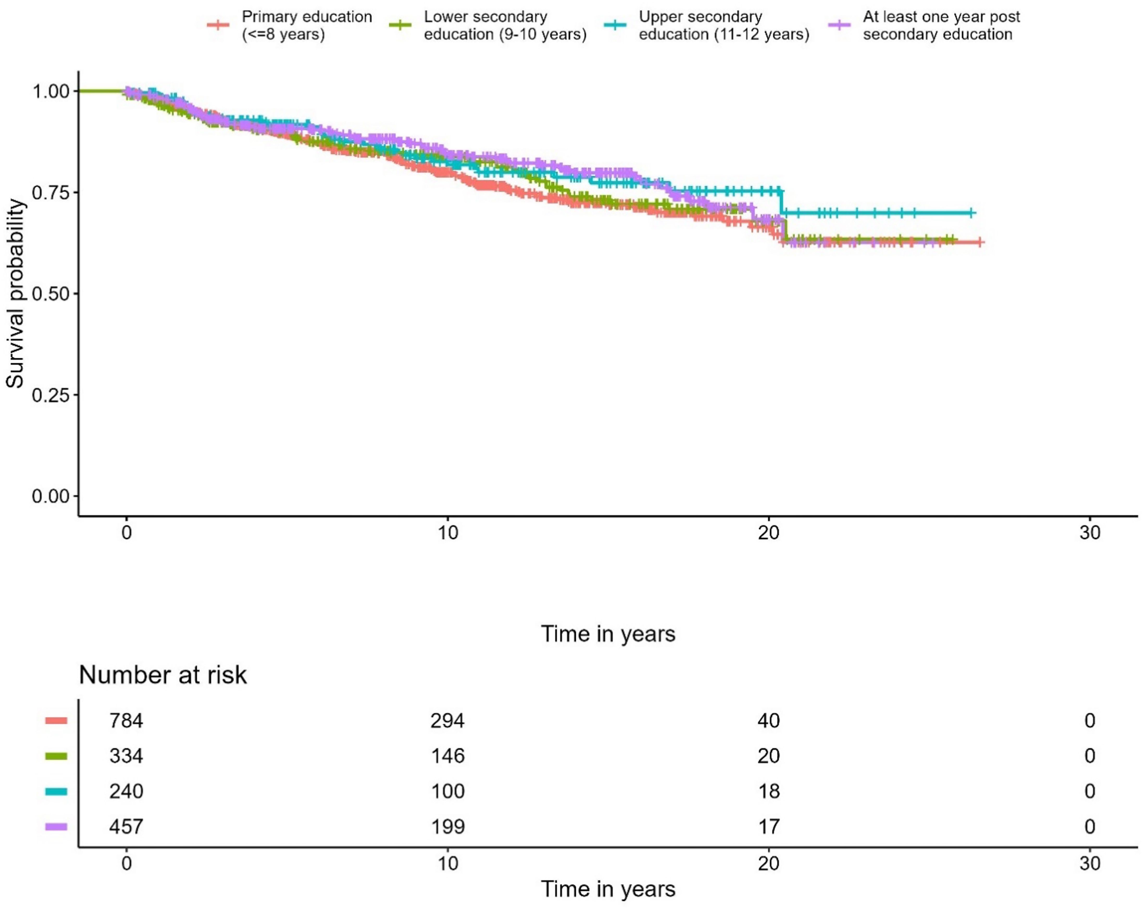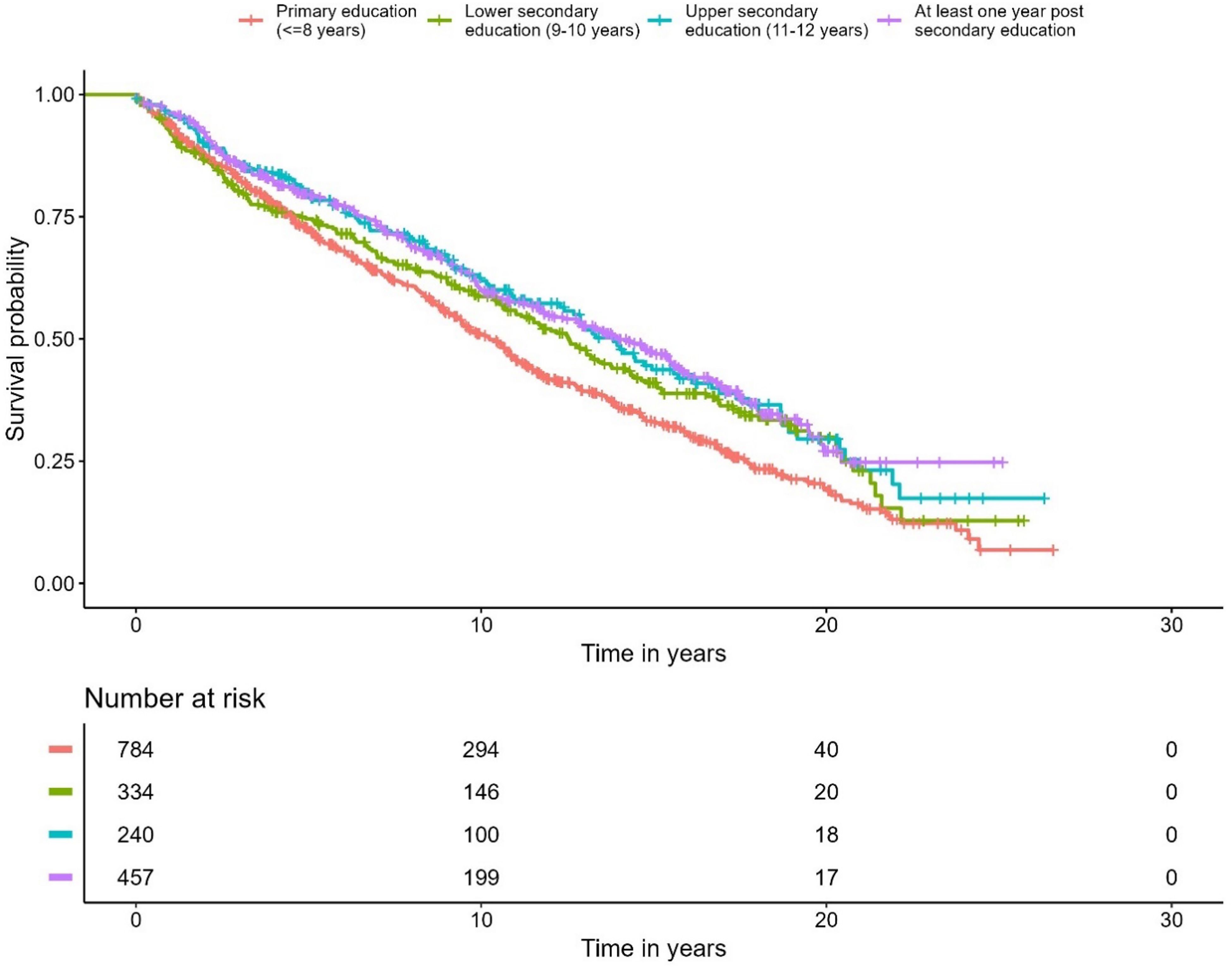 Moreover, while we report differences in overall mortality by education level, our analyses were not designed to assess the contributions of lifestyle, comorbidity, or other social determinants. This question has been addressed in prior studies but remains relevant for interpreting our results.