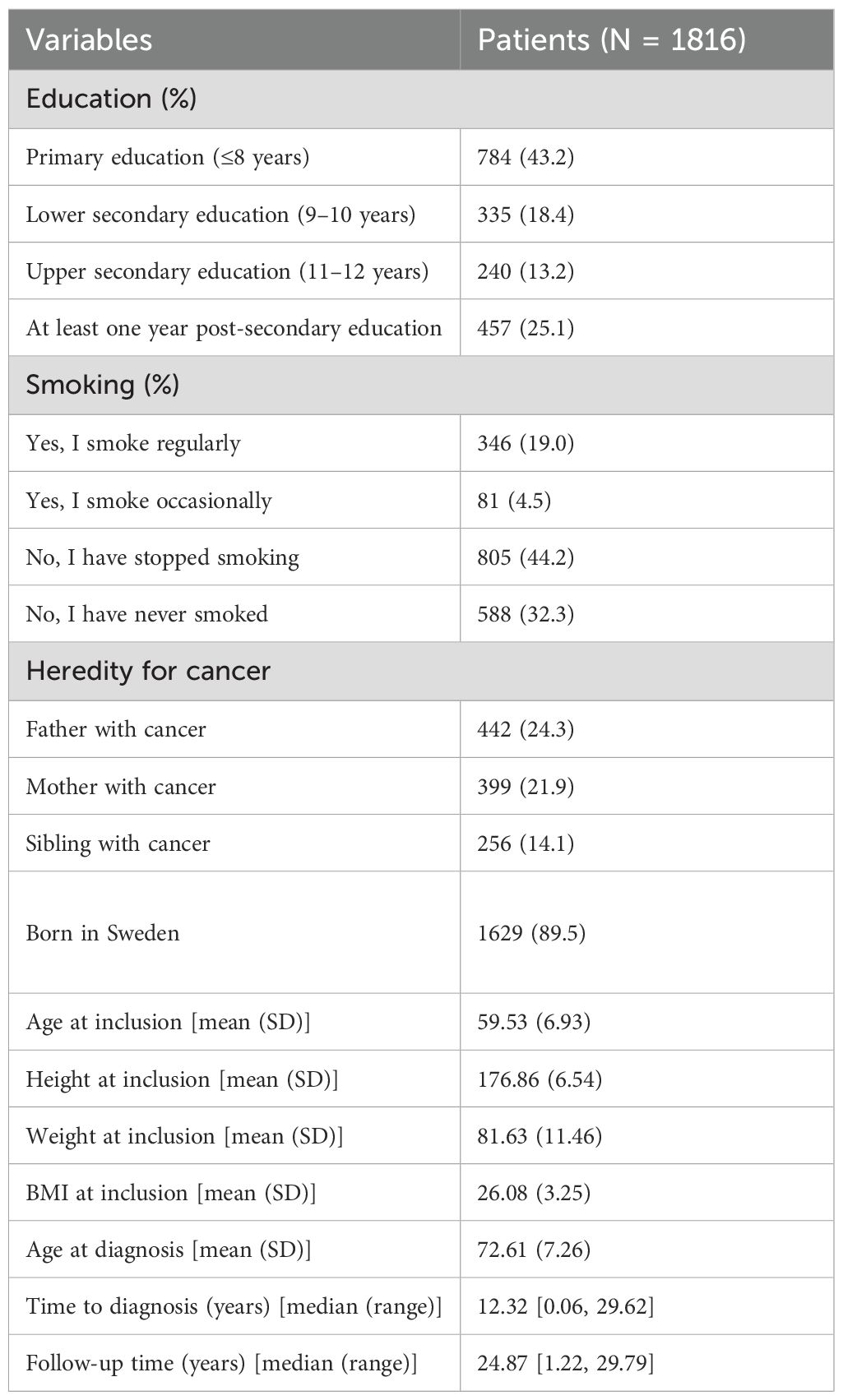 During the study period (1991–2020), 1,820 (16.7%) of the 11,063 men in the MDCS cohort were diagnosed with PCa. Full data on educational level was missing for 4 patients (0.2%) and the studied cohort therefore consisted of 1816 patients. The median follow-up time was 24.9 years, and the median age at diagnosis was 72.3 years (range 50–96 years). The largest study group (43.2%) had a primary level of education, while 18.4% had lower secondary education, 13.2% had upper secondary education and had graduated from high school, and 25.2% of the patients with PCa had some form of post-secondary education. The mean body mass index (BMI) was 26.1, and a majority (76.5%) either did not smoke or had quit smoking (Table 1).