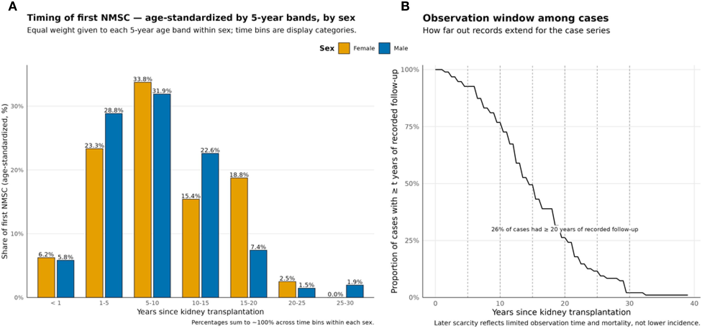 Figure 1. Occurrence of first NMSC post-kidney transplantation. (A) Age standardized shareby time bin and sex (equal weights per 5-year age band). (B) Proportion of cases by follow-up time (t) duration; dashed lines mark bin boundaries.