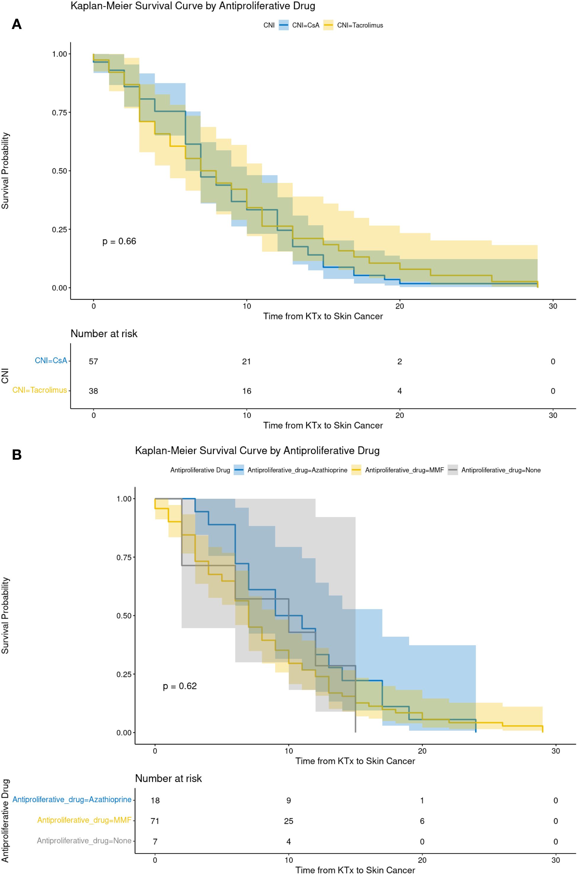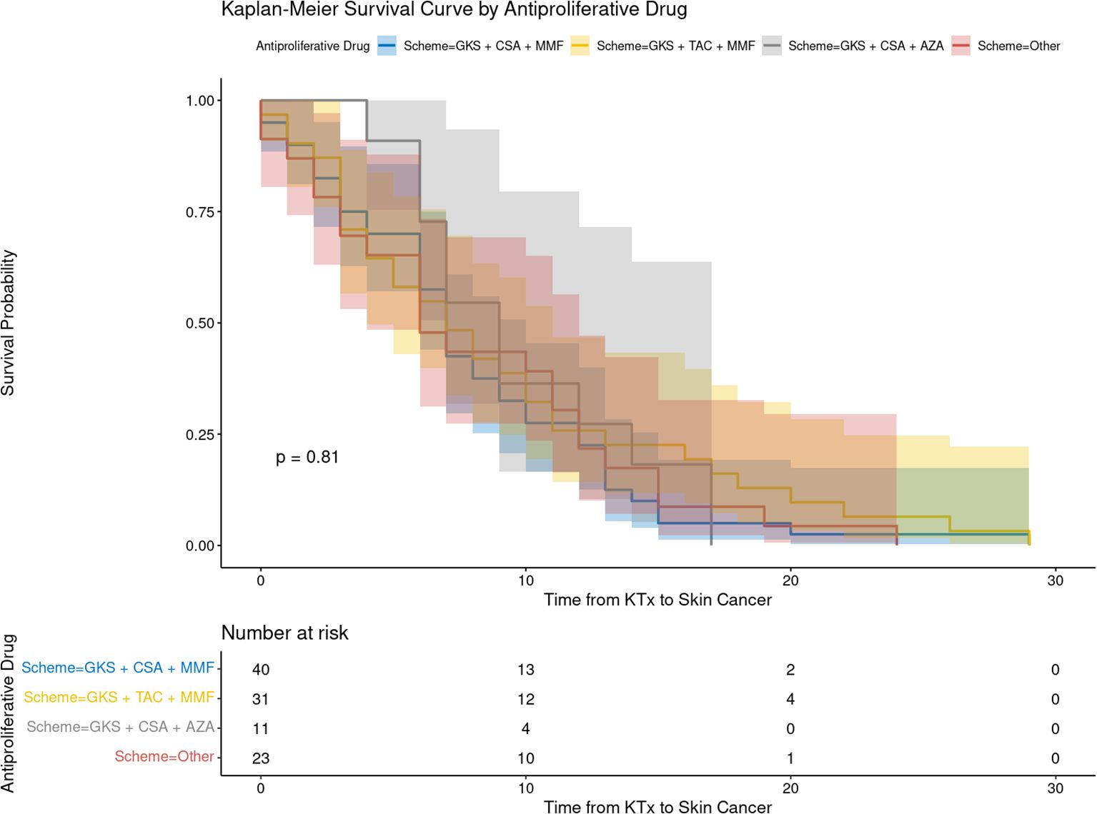 In this study, we evaluated the impact of immunosuppressive regimens on the development of skin cancer after KTx. Kaplan-Meier survival analysis and HRs were used to assess the cancer-free survival concerning various immunosuppressive protocols.
