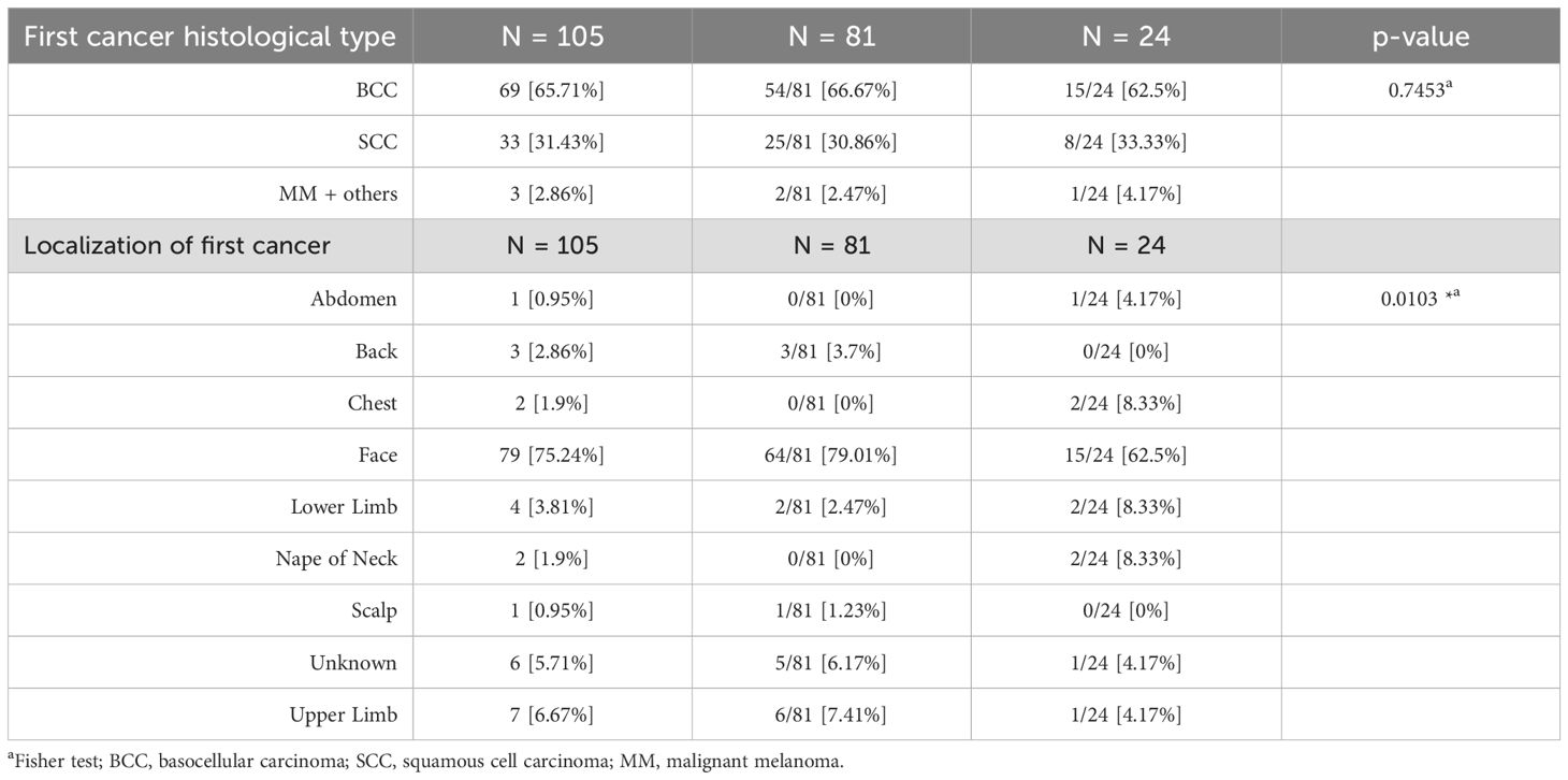 A total of 47 patients (44.8%) developed more than one skin cancer after KTx during the observation period. The mean time from the diagnosis of the first cancer to the occurrence of another one was 2 years (range: 0–10 years), and in 59.6% of cases, the histological type remained the same (42.6% for BCC and 17.2% for SCC). The highest recorded number of skin cancers in a single patient was 16 over a period of 8 years (2008–2016). Among the 33 patients in whom SCC was diagnosed, high-risk features according to the recent National Comprehensive Cancer Network (NCCN) guidelines were present in the vast majority of these cases (N = 28; 84.9%), where the tumor was located on the face, the recurrence incidence was 23.3% and immunosuppressive therapy was present all patients (16, 17).