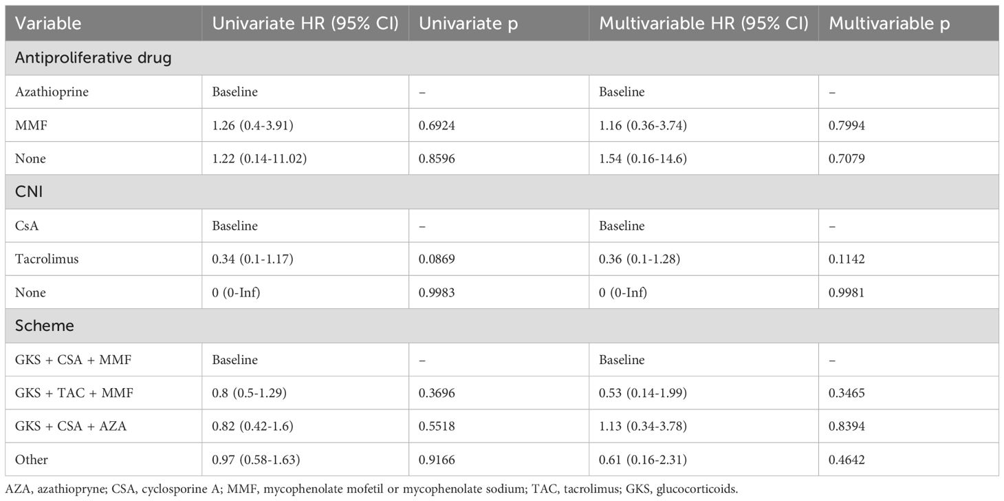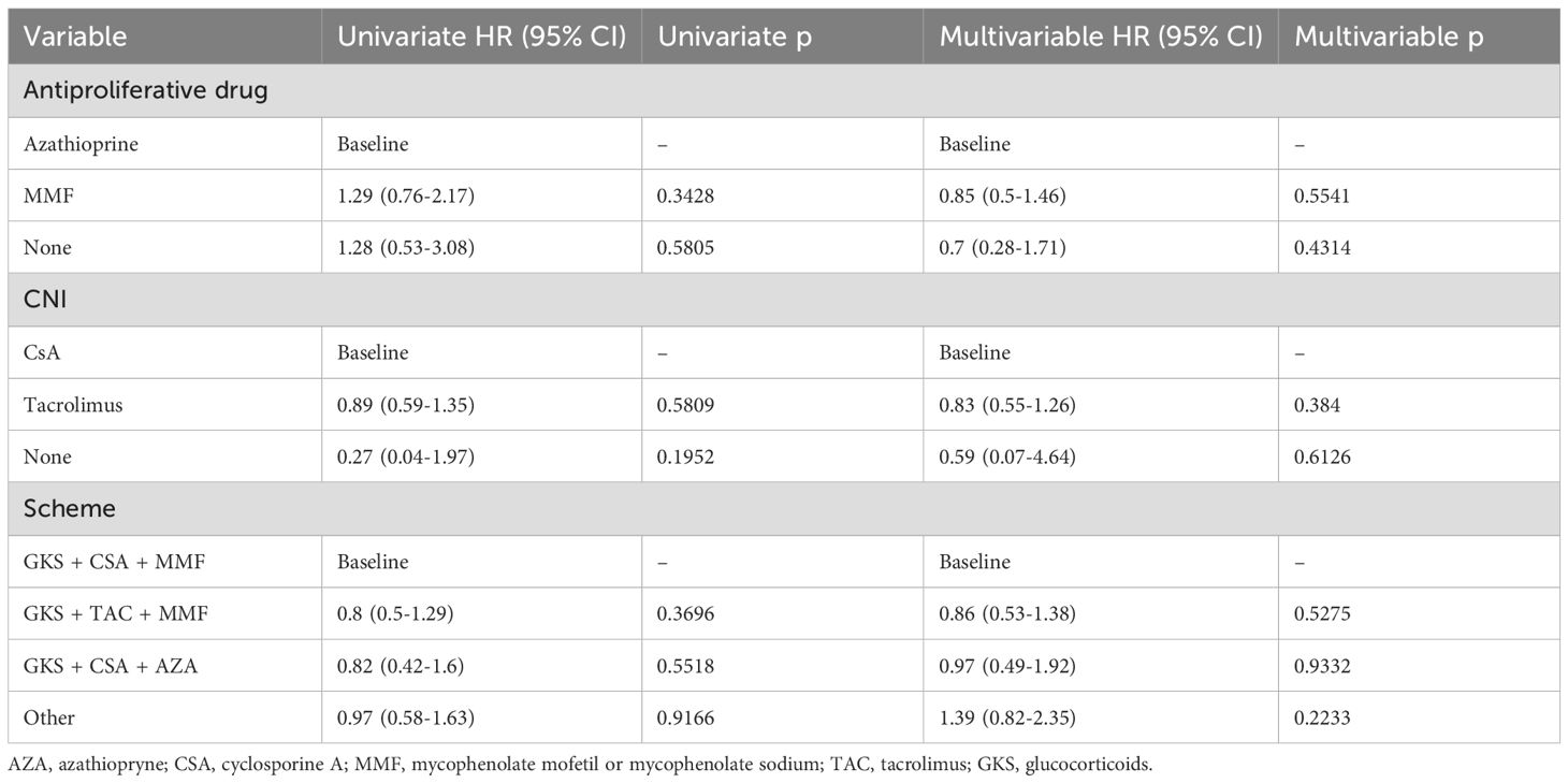 Multivariate Cox proportional hazards analysis confirmed that neither the choice of CNI nor APD significantly influenced the risk of developing skin cancer. CSA served as the reference for CNI, while AZA was the reference for APD. For CNIs, the HR for TAC, compared to CSA, was 0.83 (95% CI: 0.55–1.26; p = 0.384), while for APDs, the HR for MMF, compared to AZA, was 0.85 (95% CI: 0.5–1.46; p = 0.5541). Furthermore, analysis of different IS regimens yielded no statistically significant differences, with HRs close to 1 and p-values >0.2 for all comparisons (Table 4).