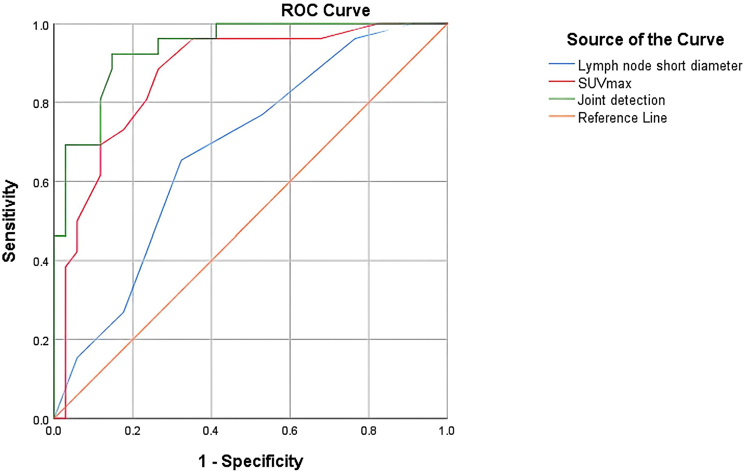 Figure 2. ROC curve evaluating the effectiveness of SUVmax, short diameter of lymph nodes, and their combination in diagnosing lymph node metastasis.