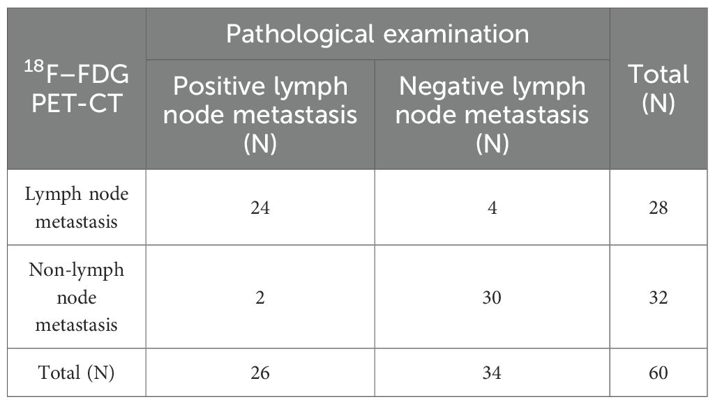 Statistical analysis was conducted using SPSS version 26.0. Categorical data are presented as frequencies. For continuous data with a normal distribution, homogeneity of variance was assessed, while non-normally distributed continuous data are expressed as medians with interquartile ranges. Chi-square tests were used to compare categorical variables, while non-parametric tests were applied for comparisons involving non-normally distributed or ordinal data. Correlation analyses were conducted to examine the relationships between 18F-FDG PET-CT parameters and lymph node status, followed by multivariate logistic regression analysis to identify independent factors influencing lymph node metastasis. A combined diagnostic approach was employed to construct a predictive model ROC curve, and the diagnostic performance of this model was evaluated. The DeLong test was used to compare the areas under the ROC curves (AUCs). A p-value of less than 0.05 was considered statistically significant.