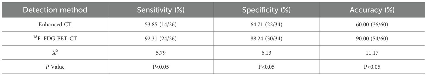 This study investigates the efficacy of 18F-FDG PET-CT and enhanced CT in assessing regional lymph node metastasis in patients with liver cancer, focusing on the imaging characteristics of regional lymph nodes. The results indicate that the sensitivity of 18F-FDG PET-CT for detecting regional lymph node metastasis in liver cancer is 92.31%, with a specificity of 88.24% and an accuracy of 90.00%. These values are significantly higher than those obtained from CT, with statistically significant differences (P < 0.05), demonstrating that the overall diagnostic value of 18F-FDG PET-CT surpasses that of CT. The sensitivity and specificity of CT in diagnosing regional lymph node metastasis in liver cancer are relatively low, primarily because the main criteria for diagnosing lymph node metastasis using CT are lymph node size and abnormal enhancement. Notably, among the 60 liver cancer patients studied, most of the metastatic lymph nodes were relatively small in size. Jiang et al. (22) found that small nodular or peripheral metastatic lymph nodes are typically smaller in size and are often challenging to diagnose. According to the RECIST criteria, metastatic lymph nodes must have a short-axis diameter of at least 15 millimeters on CT scans, while lymph nodes measuring less than 10 millimeters are considered normal. However, metastatic lymph nodes can be present in both larger and smaller lymph nodes, and not all large-diameter lymph nodes are necessarily metastatic. Therefore, relying solely on size as a criterion to assess lymph node status in liver cancer patients is inadequate. Furthermore, the enhancement pattern of lymph nodes does not have a definitive correlation with lymph node metastasis (17). Finally, the relatively low spatial resolution of CT images may contribute to these limitations, as they are easily influenced by partial volume effects. Furthermore, these techniques generally produce only cross-sectional images, which complicates the clear visualization of the morphology and internal characteristics of lymph nodes. This limitation also makes it challenging to identify small lesions or to differentiate between benign lymph nodes and potential metastatic lesions (23). Therefore, it is essential to utilize higher resolution and multi-plane reconstruction imaging techniques to achieve more accurate assessments of lymph nodes. The advent of 18F-FDG PET-CT has significantly addressed this challenge. 18F-FDG PET-CT imaging offers more reliable information, as its ability to diagnose metastatic lymph nodes is primarily based on the metabolic uptake capacity of the lymph nodes, which is less influenced by their size. PET scans can aid in identifying metastatic lymph nodes in patients, facilitating the biopsy and removal of suspicious lymph nodes situated among dense lymphatic tissue (7).