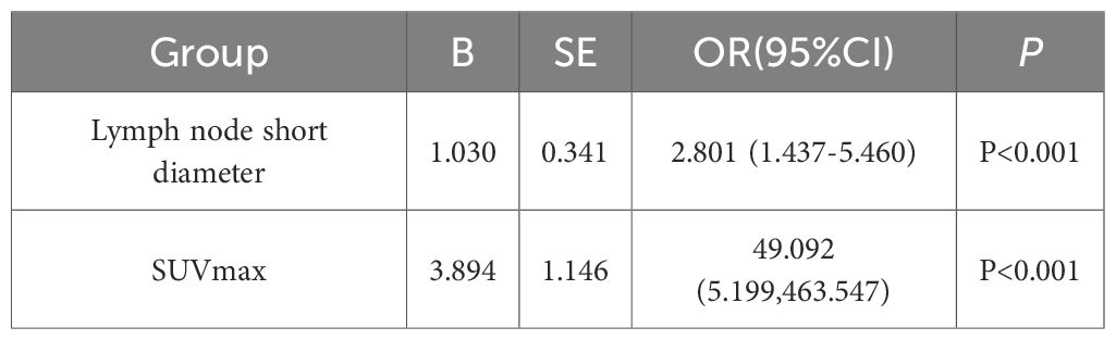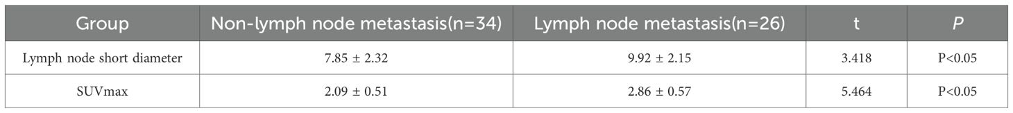 This study conducted a univariate analysis of the parameters of lymph node short diameter and SUVmax. Following a normality assessment using the Shapiro-Wilk test, the results indicated that both parameters were normally distributed. Subsequently, a homogeneity of variance test (Levene’s test) was performed, revealing that the variance of the lymph node short diameter was homogeneous (P = 0.267). Therefore, an independent samples t-test was employed. In contrast, the variance of SUVmax was not homogeneous (P = 0.031), necessitating the use of Welch’ s corrected t-test. The results indicated that both the lymph node short diameter and SUVmax in the lymph node metastasis group were significantly higher than those in the non-lymph node metastasis group, with these differences being statistically significant (P < 0.05) (Table 5).