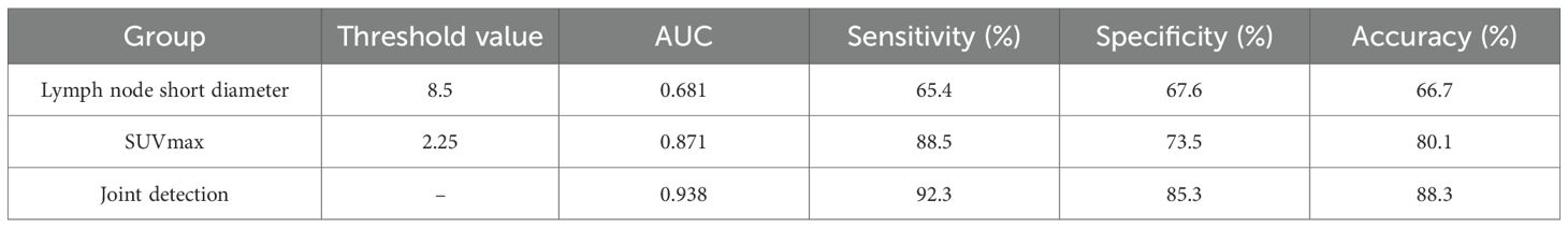 Table 8. Comparison of the diagnostic value of the combined diagnosis of lymph node short diameter and SUVmax with that of individual parameters.