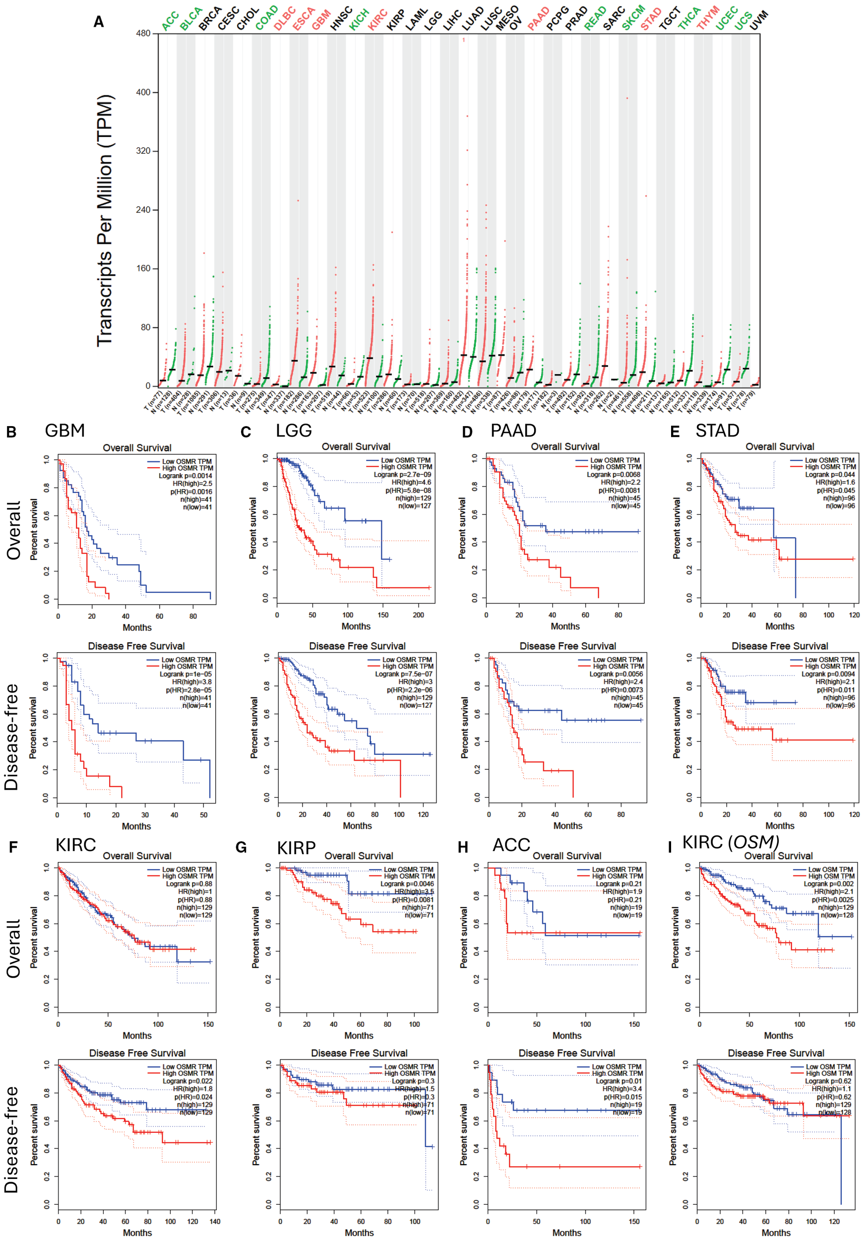 Chart A displays transcripts per million (TPM) data across various cancer types, highlighting different expression levels. Charts B to I show survival plots for different cancers, including GBM, LGG, PAAD, STAD, KIRC, KIRP, ACC, and KIRC (OSM). Each plot compares overall and disease-free survival between low and high OSMR TPM levels, with statistical details included, such as hazard ratios and p-values. The survival curves are color-coded, with blue and red representing high and low TPM levels, respectively.