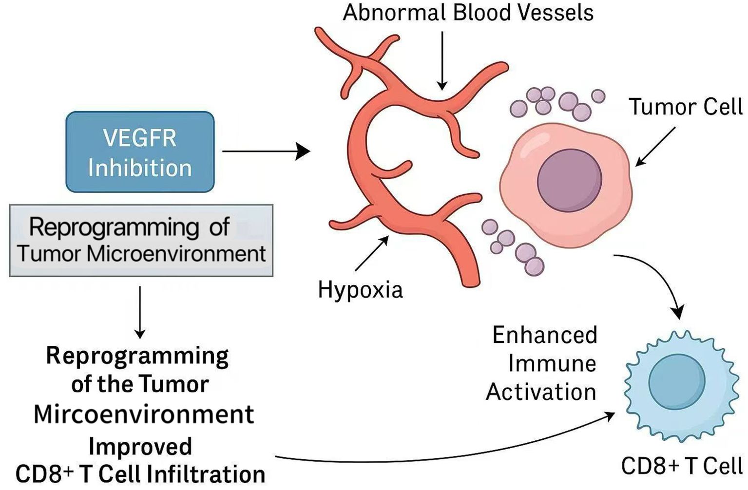 Beyond chemical immunotherapy, multimodal strategies combining immune checkpoint inhibitors, anti-angiogenic drugs, and chemotherapy have shown encouraging potential in increasing conversion rates. Antiangiogenic therapy enhances this synergy by normalizing the tumor vascular system, alleviating hypoxia, and reprogramming the tumor microenvironment (TME). These changes promote CD8+ T cell infiltration and effector function, while immune checkpoint blockade restores T cell activity (30, 31). These mechanisms jointly drive the synergistic anti-tumor immune response, as shown in Figure 1.