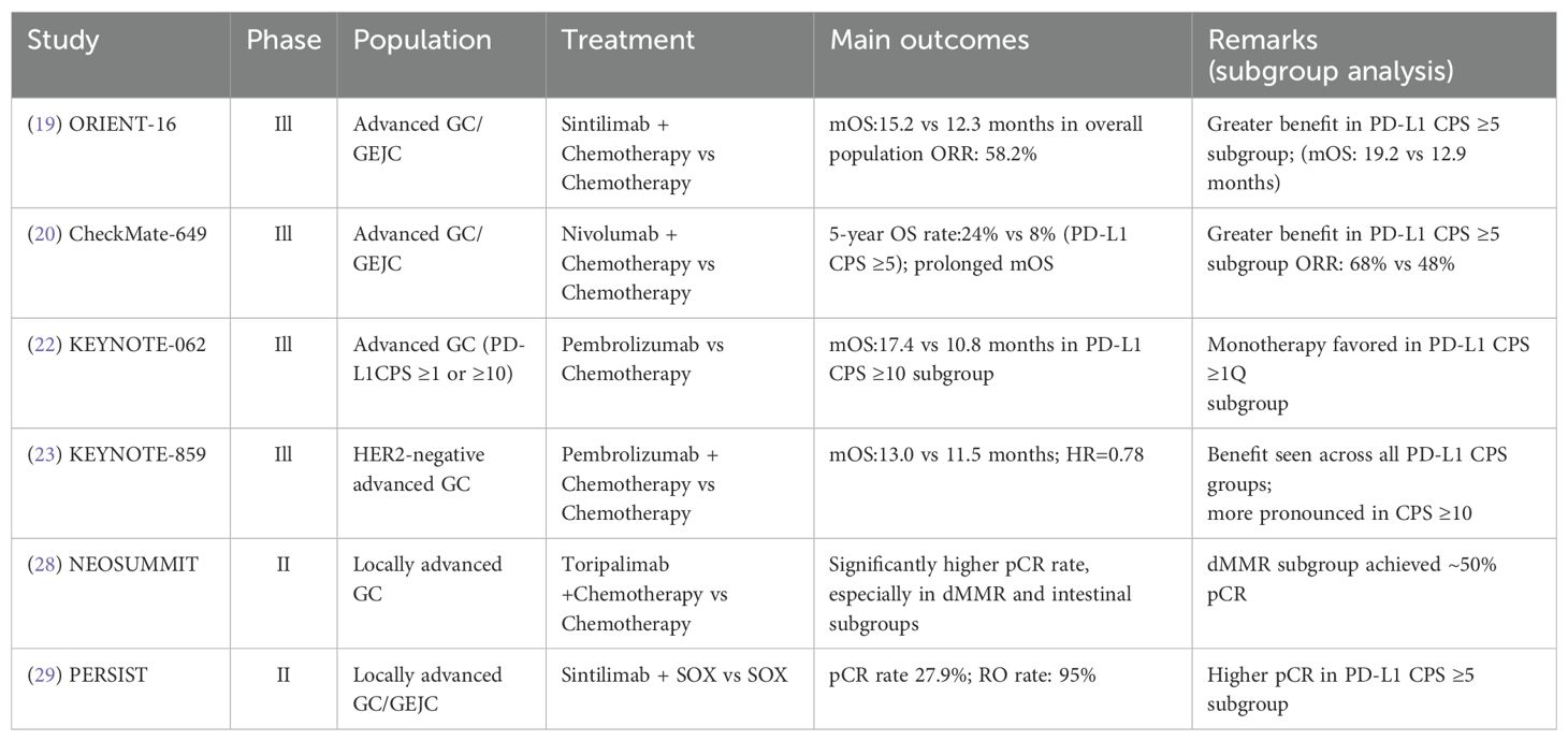 Against the backdrop of survival benefits achieved with immunotherapy in advanced gastric cancer, several pivotal phase III trials have explored its application in earlier stages, particularly in patients with borderline resectable or locally advanced disease. Although these studies are largely designed as perioperative trials, many enrolled populations that reflect typical conversion therapy scenarios—namely, tumors initially deemed unresectable or marginally operable. As such, these findings have important implications for immunotherapy-driven conversion strategies aiming to enhance resectability and long-term outcomes.