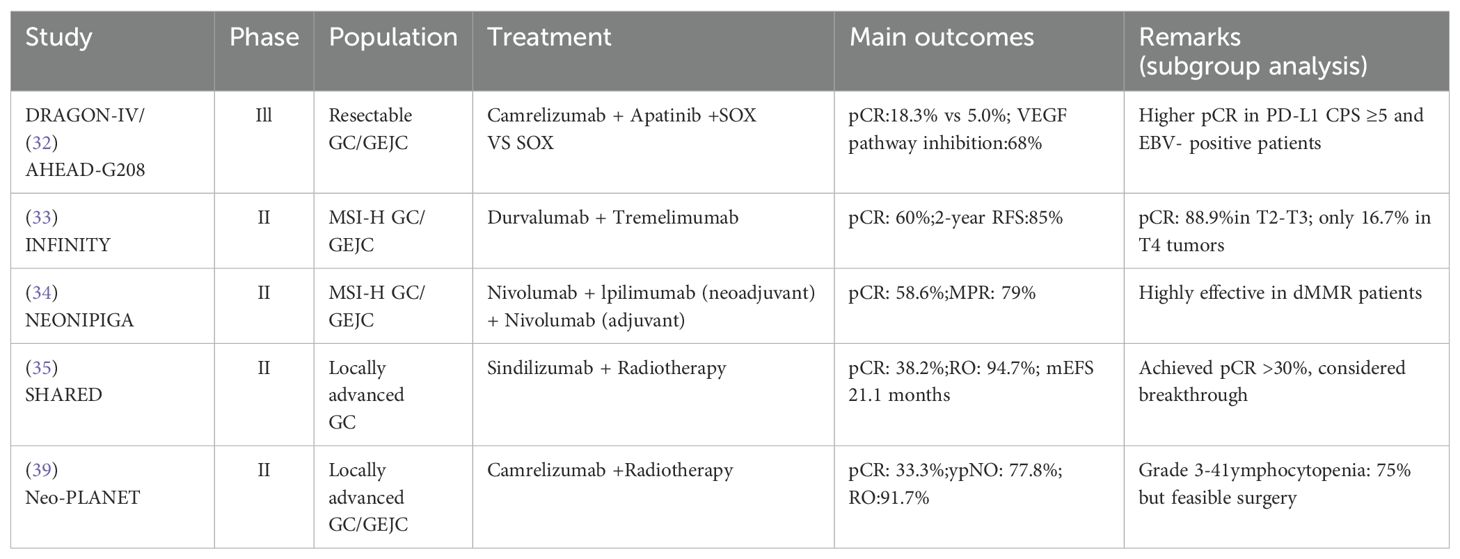 Acknowledging regional variations in tumor biology and treatment response, two pivotal Chinese phase II studies-NEOSUMMIT (28) and PERSIST (29)-have provided key evidence supporting immunotherapy-based conversion strategies in East Asian populations. The NEOSUMMIT trial (NCT04354662) enrolled 108 patients with locally advanced GC/GEJC and randomized them to receive toripalimab plus SOX/XELOX or chemotherapy alone. The immunotherapy arm demonstrated significantly higher rates of tumor regression grade (TRG) 0/1 (44.4% vs 20.4%; P = 0.009) and pCR: 22.2% vs 7.4%; P = 0.030). Notably, all six patients in the dMMR subgroup achieved pCR, compared to none in the control group. Tumor downstaging (ypT0-2) occurred more frequently with toripalimab (46.3% vs 22.2%; P = 0.008). Patients with intestinal or mixed histological types exhibited better responses than those with diffuse-type tumors (2.3-fold higher, P < 0.01). Adverse event rates were comparable (TRAEs: 37.0% vs 33.3%), and immune-related toxicities remained manageable. The PERSIST trial (29) (NCT04982939) adopted a “sandwich” strategy-neoadjuvant immunotherapy, surgery, and adjuvant immunotherapy-using sintilimab combined with SOX in 240 patients with locally advanced GC/GEJC. The combination group achieved a pCR rate of 27.9%, significantly higher than 4.8% in the control arm (P < 0.001), and a major pathological response (MPR,≤10% residual tumor) rate of 65.2% versus 20.4%. Tumor downstaging was observed in 79.7% of patients, and the R0 resection rate exceeded 91% (91.8% vs 89.3%). Grade 3–4 TRAEs occurred in only 4.1% of cases, and no perioperative mortality was reported. As the first phase II trial to validate a domestically developed PD-1 inhibitor in this context, PERSIST strongly supports the feasibility and safety of conversion immunotherapy in Chinese patients. Together with NEOSUMMIT, it highlights the potential for enhanced immunotherapeutic sensitivity in East Asian populations, possibly due to higher prevalence of proximal tumors, Epstein-Barr virus (EBV) positivity, and favorable molecular subtypes such as dMMR/MSI-H and intestinal histology. Table 1 lists an overview of key clinical trials investigating chemoimmunotherapy in conversion therapy.