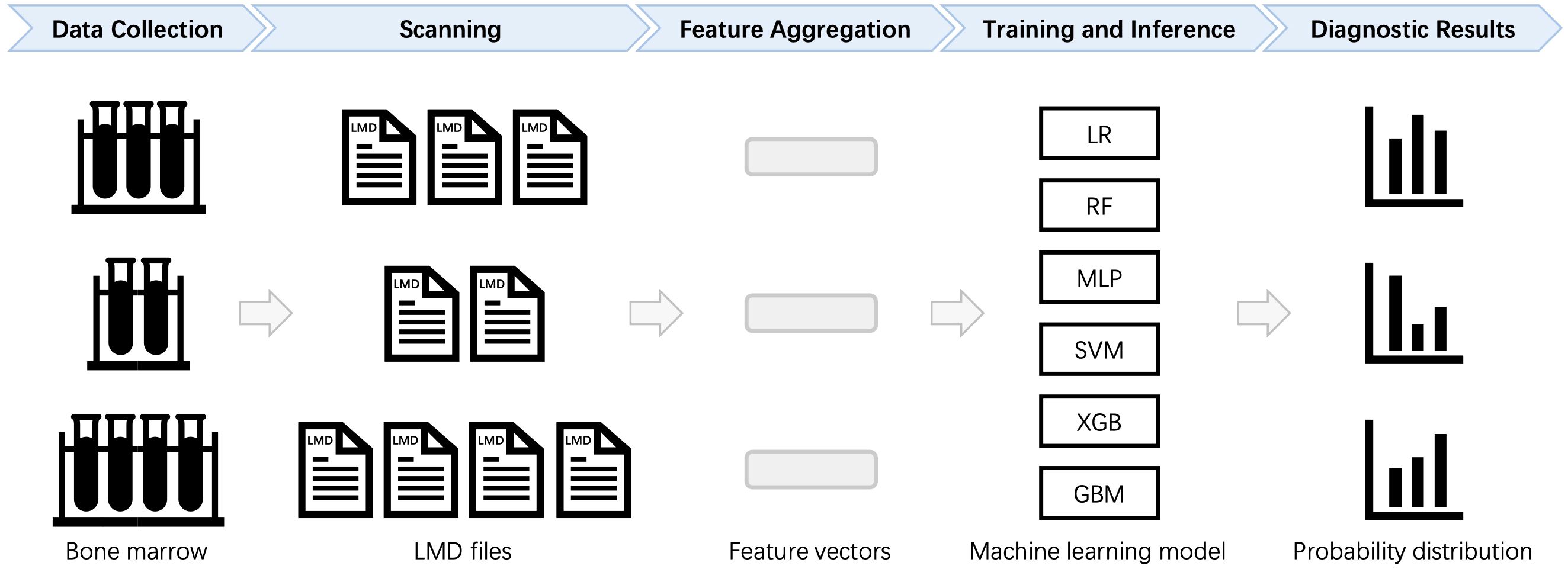 Figure 1. Automated diagnostic workflow for flow cytometry data analysis. For each patient, multiple LMD files are processed to calculate statistical features, which are then aggregated into a standardized format. The formatted data are subsequently input into a machine learning (ML) model for training and classification. LR, Logistic Regression; RF, Random Forest; MLP, Multilayer Perceptron; SVM, Support Vector Machine; XGB, Extreme Gradient Boosting; GBM, Gradient Boosting Machine.