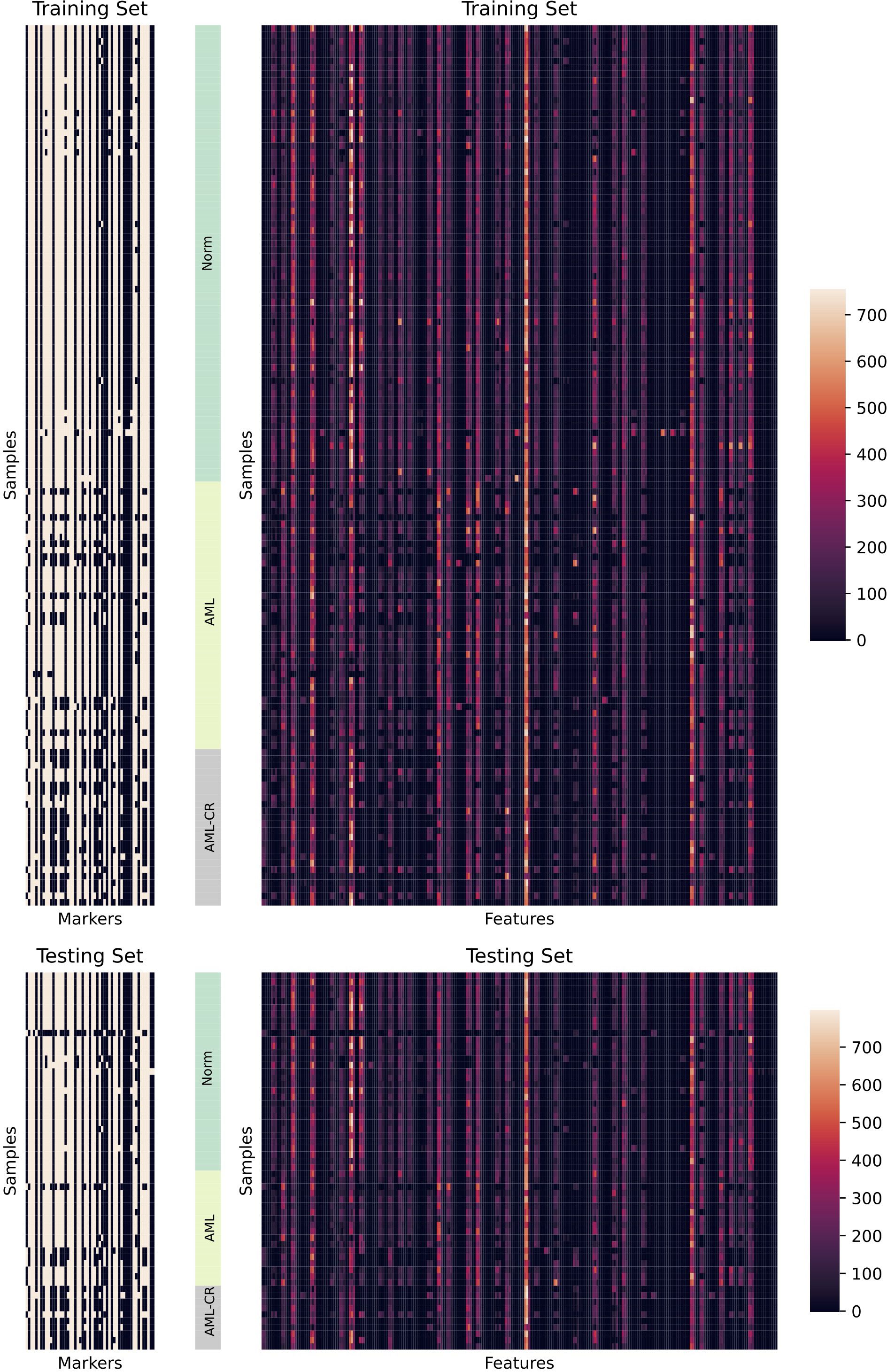 Figure 2. A detailed visualization of the dataset is presented. The left panel illustrates the distribution of markers across different samples, while white indicates the presence of corresponding markers and black indicates their absence. The right panel displays the distribution of features extracted from different samples. Here, Markers refers to the 53 cell surface markers analyzed, while Features represents the 265 statistical features derived from the 53 markers.
