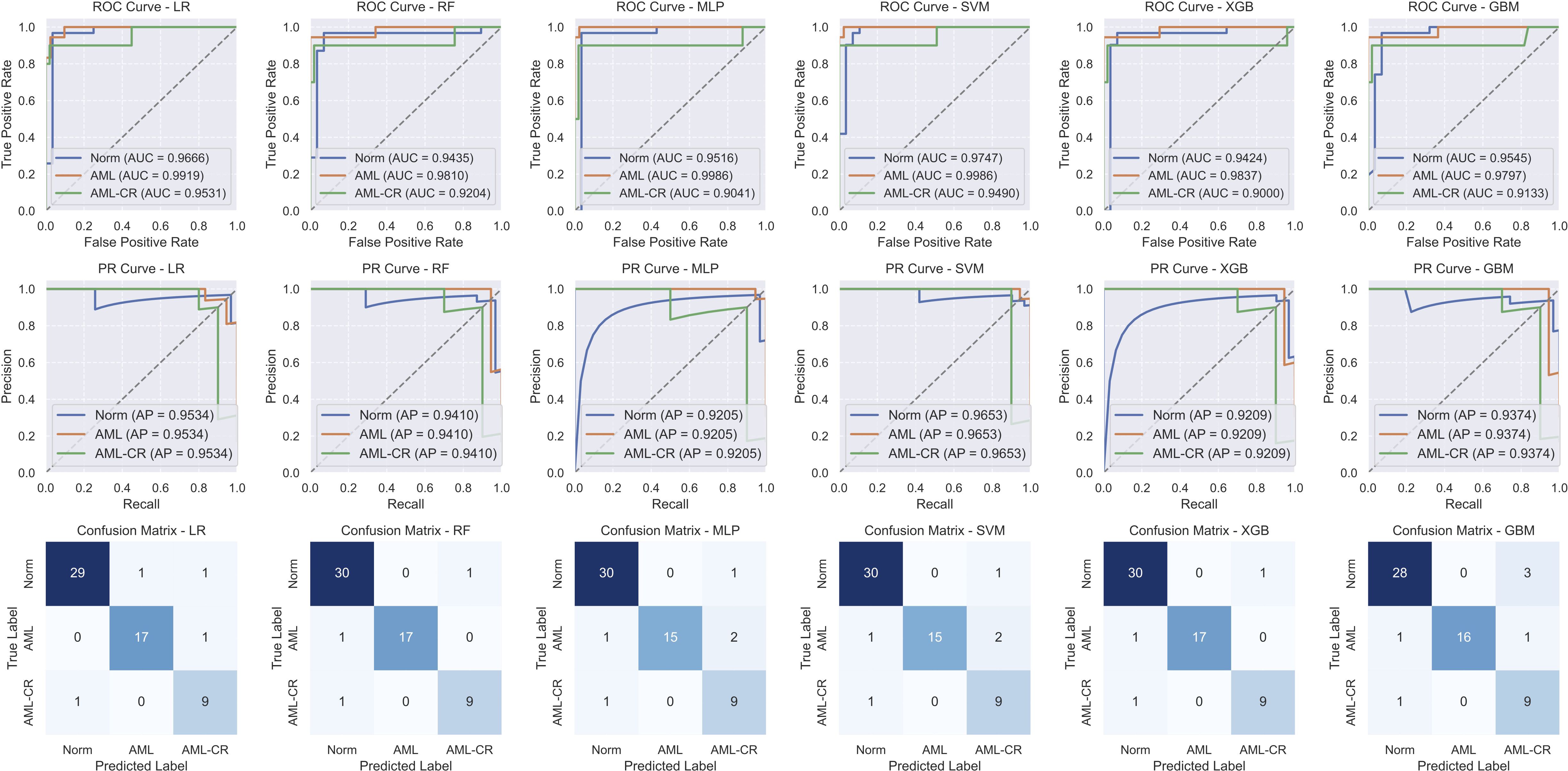 Methods: To address these challenges, we developed a machine learning–based classification framework that integrates heterogeneous flow cytometry data. A dataset comprising 53 markers was collected, and six different machine learning classifiers were trained to distinguish between AML, complete remission (AML-CR), and normal samples. Model performance was evaluated using accuracy, precision, recall, F1 score, and area under the ROC curve (AUC).