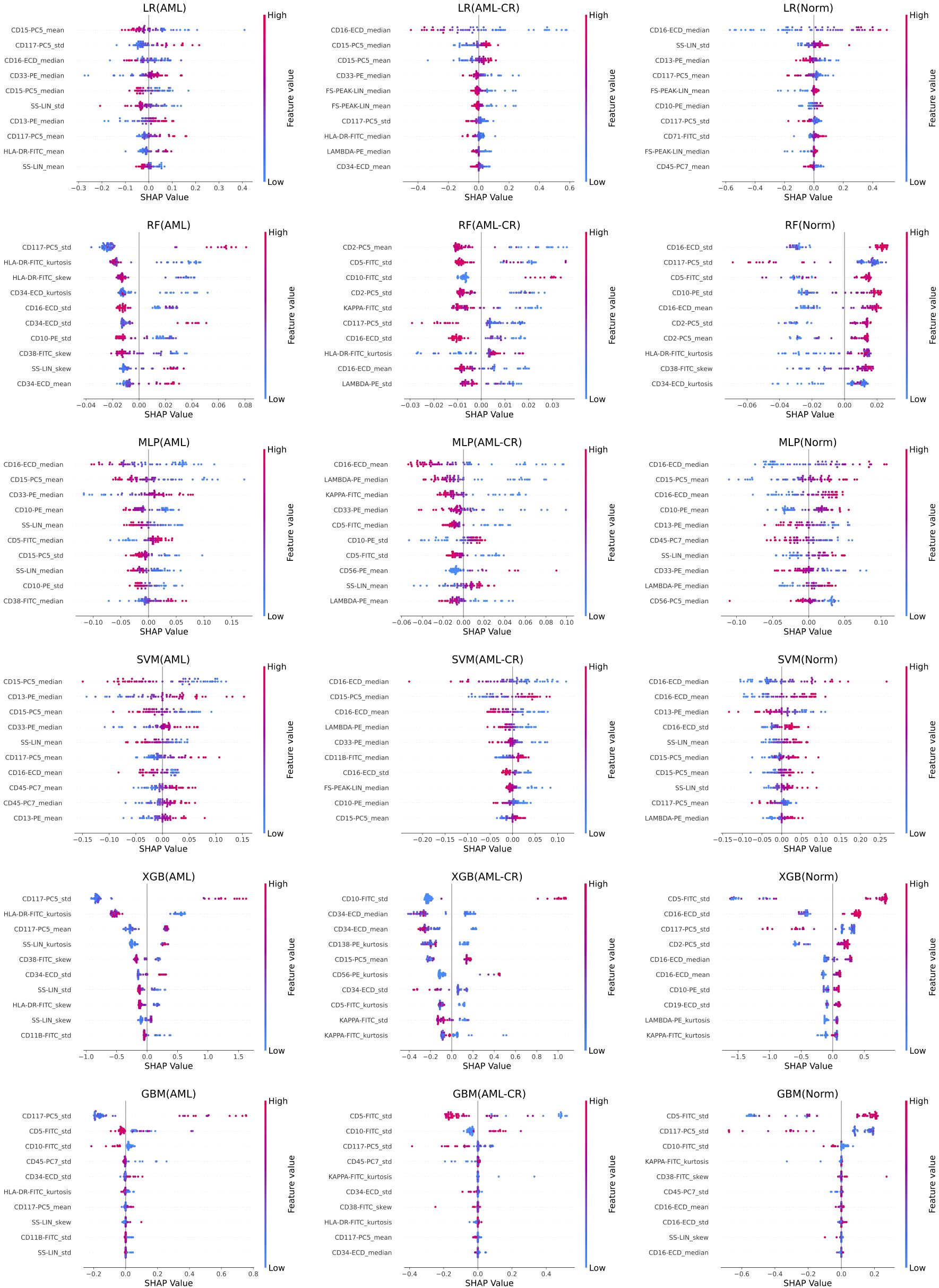 Figure 4. The feature importance analysis of different models based on SHAP. Each row represents the SHAP feature importance analysis results of a method on acute myeloid leukemia (AML), acute myeloid leukemia complete remission (AML-CR), and normal (Norm) classes, respectively. LR, linear regression; RF, random forest; MLP, multi-layer perceptron; SVM, support vector machine; XGB, extreme gradient boosting; GBM, gradient boosting machine.
