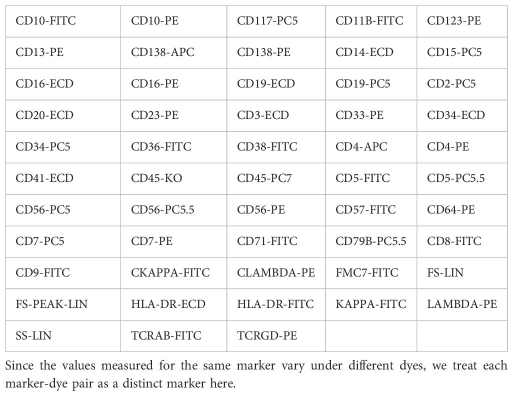 In recent years, machine learning (ML) has achieved remarkable advancements in intelligent medical diagnosis, particularly in disease classification, prediction, and personalized treatment (10–12). ML excels at automatically learning from large-scale datasets and uncovering underlying patterns (13), offering unparalleled advantages over traditional methods, especially when processing complex and high-dimensional biomedical data such as flow cytometry data (14). However, existing models may not be directly applicable to real-world flow cytometry diagnostic scenarios due to the unstandardized nature of flow cytometry data, which often fails to meet the input requirements of these models. Specifically, in practical settings, the performance limitations of flow cytometry instruments necessitate the use of multiple panels to obtain comprehensive data for a single patient. For instance, the same marker may be labeled with different fluorescent dyes, leading to variations in the measured values. Such discrepancies are rarely encountered in publicly available standardized datasets, where each sample typically employs a consistent combination of markers and dyes (15). Furthermore, existing studies on flow cytometry datasets frequently overlook the analysis of patients with complete acute myeloid leukemia remission (AML-CR), which oversight limits the comprehensive understanding of patient data distribution, impairs the evaluation of treatment efficacy, and hinders the monitoring of disease relapse risk.