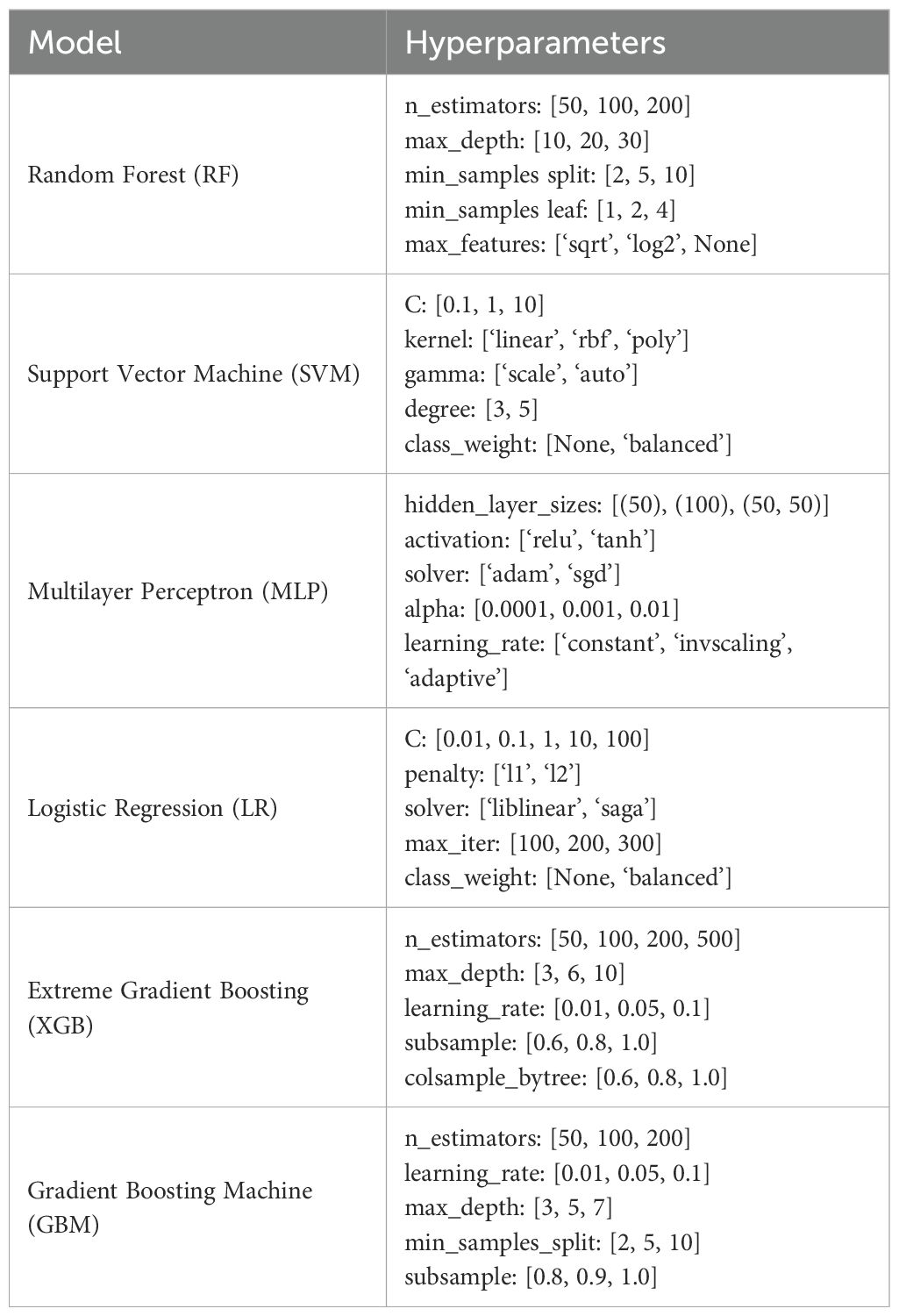 The flow cytometry data is randomly split into training and testing sets in a 7:3 ratio. To ensure a comprehensive evaluation, this study employs six widely used ML algorithms, encompassing various classical approaches. These include linear models [Logistic Regression, LR (18)], ensemble methods [Random Forest, RF (19); Extreme Gradient Boosting, XGBoost (20); Gradient Boosting Machine, GBM (21)], neural networks [Multilayer Perceptron, MLP (22)], and support vector machines [Support Vector Machine, SVM (23)]. Each algorithm represents a distinct learning paradigm: linear models effectively capture linear relationships and are suitable when interpretability and simplicity are important, ensemble methods enhance predictive performance by aggregating multiple weak learners and work well for complex, nonlinear, and noisy data, neural networks excel at modeling complex nonlinear patterns and are particularly effective with large datasets and intricate feature interactions, support vector machines are well-suited for high-dimensional classification tasks, especially when the classes are separable with clear margins. All models are implemented using scikit-learn==1.6.1 in Python 3.10. In the training set, all flow cytometry data are divided into five parts, and five-fold cross-validation is applied. This strategy helps assess the stability and generalization ability of the model by cycling through each subset as the validation set. During cross-validation, grid search is used to optimize the hyperparameters. The specific parameter search space for each method is shown in Table 2. The evaluation metrics include accuracy, F1-score, precision, recall, and area under the curve (AUC). These metrics collectively reflect the model’s performance in the classification task, with particular significance for F1-score and AUC when handling imbalanced data. In addition, to analyze the contribution of features to the prediction, shap==0.46.0 (24) is used to estimate feature importance. Based on the concept of Shapley values, SHAP assigns an importance value to each feature, thereby helping to explain the model’s decision-making process and enhancing the model’s interpretability and reliability.