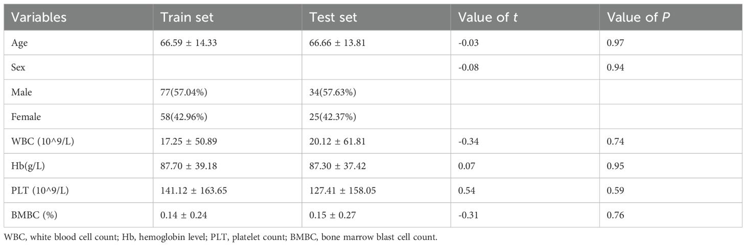 We enrolled 59 patients with acute myeloid leukemia (AML, non-M3), 34 patients who achieved complete bone marrow remission after treatment (AML-CR), and 101 individuals with normal bone marrow flow cytometry results (Norm). The dataset is randomly divided into a training set (n=135) and a test set (n=59) in a 7:3 ratio. The collected variables encompassed demographic characteristics (age and sex), routine blood parameters (white blood cell count, hemoglobin level, and platelet count), the proportion of bone marrow blasts/immunized cells, and 53 commonly used markers from flow cytometry data. The baseline characteristics of the participants are summarized in Table 3. The mean age of patients in the training set is 66.59 years (66.59 ± 14.33), while that in the test set is 66.66 years (66.66 ± 13.81), with no statistically significant difference between the two groups (P > 0.05). Chi-square analysis revealed no significant differences (P > 0.05) in any of the examined variables between the training and test sets, indicating similar distribution patterns across all factors. These results demonstrate that both the training and test sets are well-balanced and appropriate for subsequent predictive analysis.