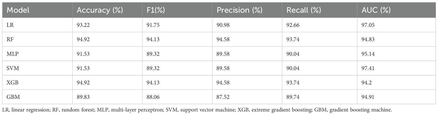 Table 4 and Figure 3 present the performance of different models in the classification task. Overall, both RF and XGB achieved superior results across all metrics, with F1-score, precision, and recall reaching 0.9413, 0.9458, and 0.9374, respectively, and an accuracy of 0.9492. These results indicate strong generalization capabilities for these two models in the classification task. LR exhibited a high AUC value (0.9705); however, its F1-score (0.9175) and precision (0.9098) are slightly lower than those of RF and XGB, suggesting some degree of misclassification. Both MLP and SVM demonstrated identical classification performance, with an accuracy of 0.9153 and an F1 score of 0.8932. Notably, SVM achieved the highest AUC value (0.9741), although its other metrics are lower than those of RF and XGB. GBM performed slightly worse than the other models, with the lowest accuracy (0.8983) and F1 score (0.8806). Although its AUC value reached 0.9491, its precision (0.8752) and recall (0.8974) exhibited a certain gap, possibly due to the model’s limited ability to distinguish between specific classes. Overall, RF and XGB demonstrated robust performance across all metrics, making them the most suitable candidates for this task. Meanwhile, SVM, with the highest AUC value, may offer advantages in certain application scenarios. Additionally, confusion matrix analysis revealed that the misclassified samples are evenly distributed across different categories, indicating that these models maintained a balanced classification error across classes.