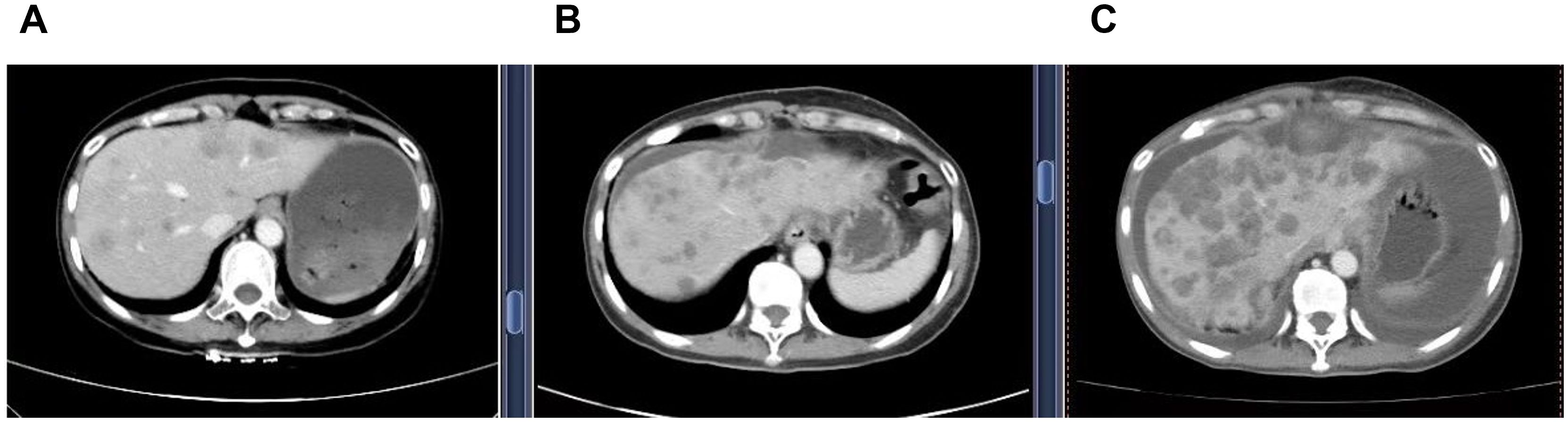 Figure 1. Serial contrast-enhanced abdominal CT images demonstrating progression of hepatic metastases. (A) (21 April 2023) Multiple new hypodense liver nodules of varying sizes, the largest measuring 5.0 x 3.6 cm. The lesions demonstrate mild, heterogeneous, enhancement with ill-defined margins. These findings are new compared to the prior examination and are consistent with metastatic disease. (B) (16 July 2024) Increase of low-density hepatic nodules with ill-defined margins, and mild heterogeneous enhancement. The dominant lesion in the quadratic lobe measures 5.7 cm x 4.9 cm, showing peripheral fusion and subcapsular extension, consistent with disease'progression. (C) (22 October 2024) Increase in both size and number of multifocal low-density hepatic nodules, with mild heterogeneous enhancement, ill-defined margins, and areas of confluence. The largest lesion in the left lobe measures 7.1 cm x 4.9 cm. These findings are consistent with progressive metastatic disease.
