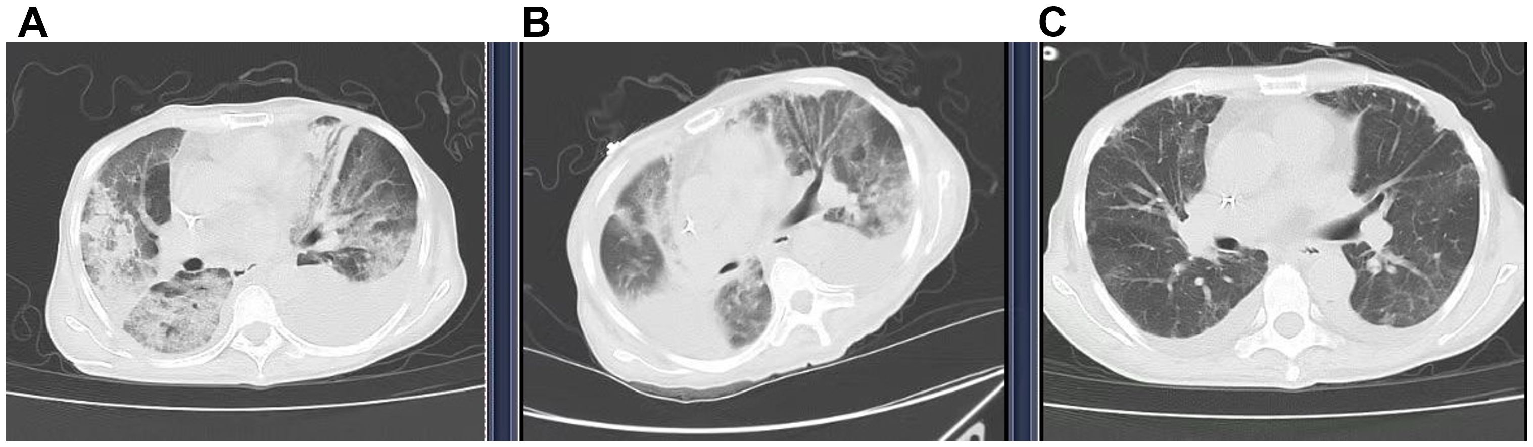 Figure 2. Computed tomography (CT) showed the transition of ILD. (A) (29 Nov 2024) New diffuse bilateral patchy opacities with heterogeneous attenuation and ill-defined margins. Increased bilateral pleural effusions (moderate left, small right). (B) (5 Dec 2024) Diffuse bilateral opacities with heterogeneous attenuation, partial resolution (RML, left lung) but progression (RUL, right upper lobe). The right pleural effusion has increased and is partially encapsulated, whereas the left effusion has decreased slightly. (C) (11 Dec 2024) Significant resolution of bilateral diffuse opacities and reduction of bilateral pleural effusions.