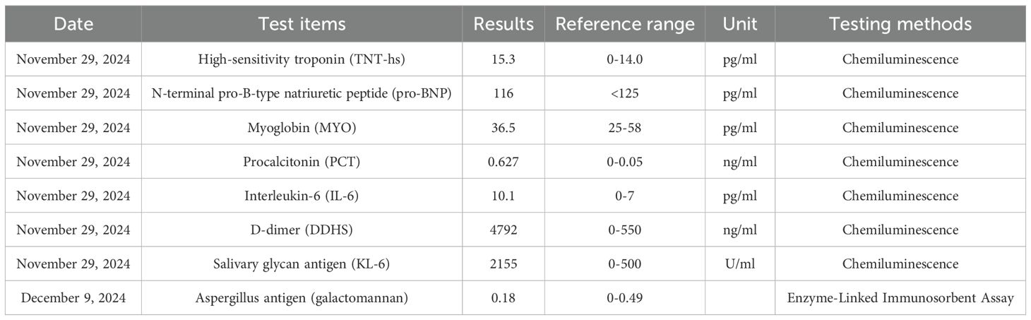 On November 28, 2024, she experienced sudden chest tightness and shortness of breath, with peripheral blood oxygen saturation (SpO2) of 50-70% on room air. Fine moist rales were auscultated in the upper and middle lung fields. Bedside ultrasound showed large bilateral pleural effusions, atelectasis, normal cardiac systolic function, and no signs of thrombosis. No significant abnormalities were found on urgent laboratory testing, including procalcitonin, D-dimer, NT-proBNP, and troponin T levels (Table 2). High-resolution chest CT (≤1.5mm thick, Figure 2A) showed diffuse patchy lesions in both lungs with uneven density and unclear edges, and bilateral pleural effusions (moderate on the left, small on the right. Based on the exclusion of alternative diagnoses (infection, pulmonary embolism, and heart failure) through the above workup, along with a history of T-DXd exposure, characteristic clinical features, and supportive CT imaging, a definitive diagnosis of interstitial pneumonitis was made.